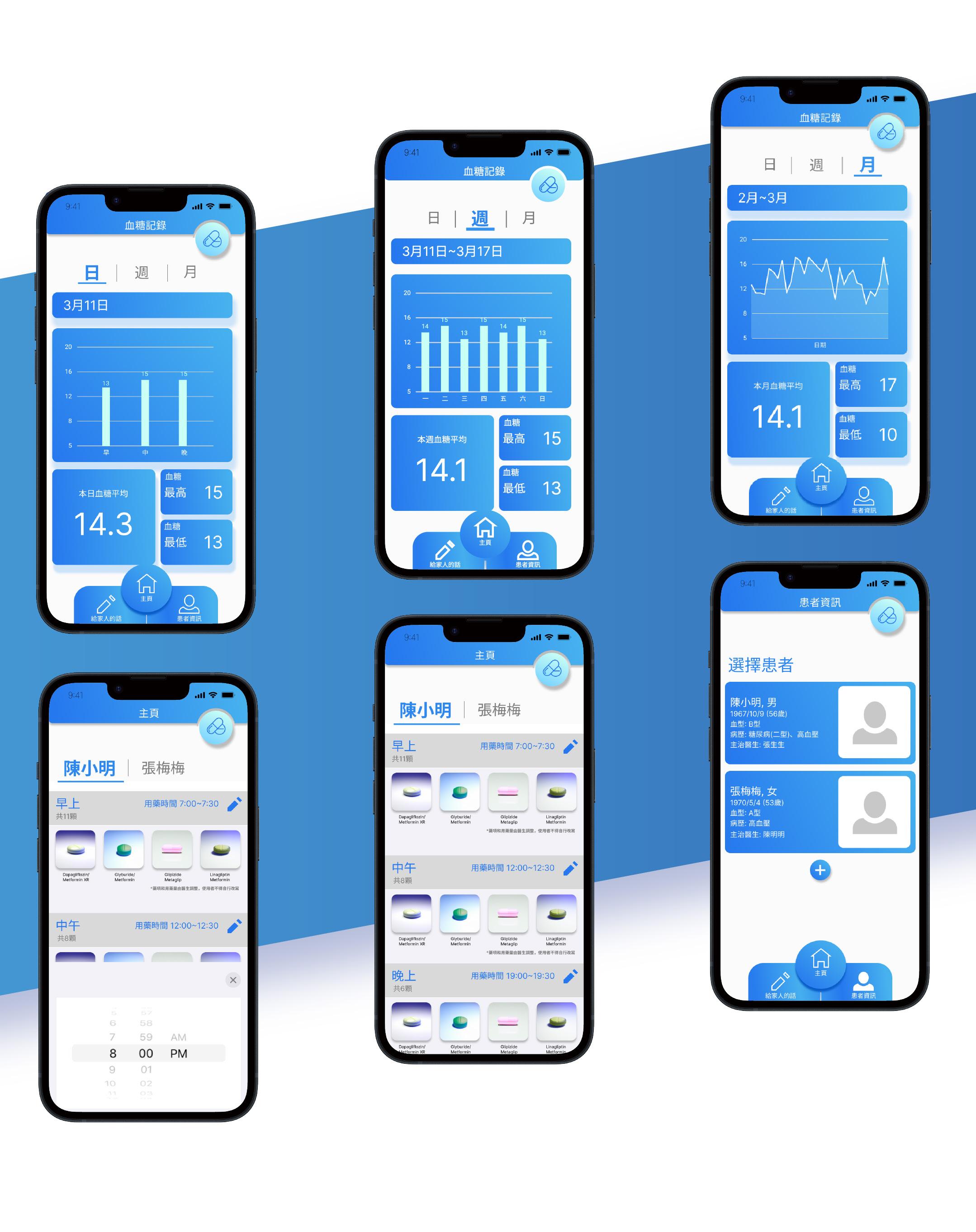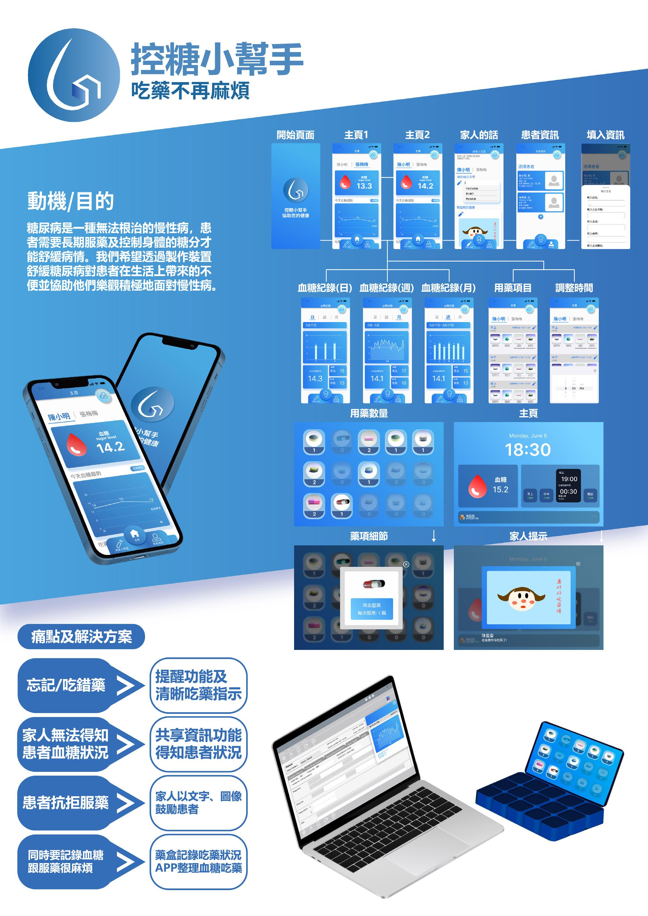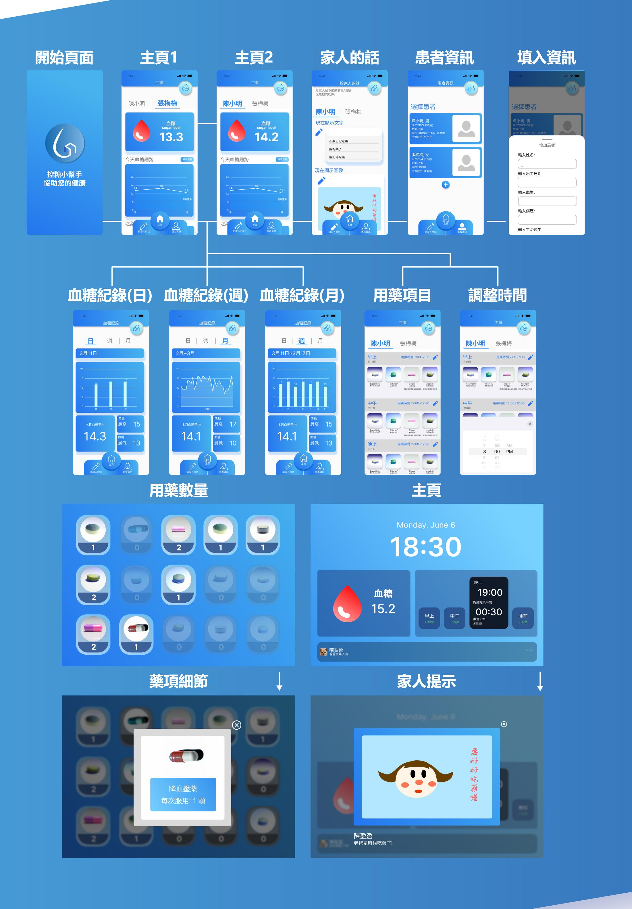 控糖小幫手是一款給合手機APP及智慧藥盒的產品。 藍色的漸層介面 及簡約易用的是這款產品的特色。