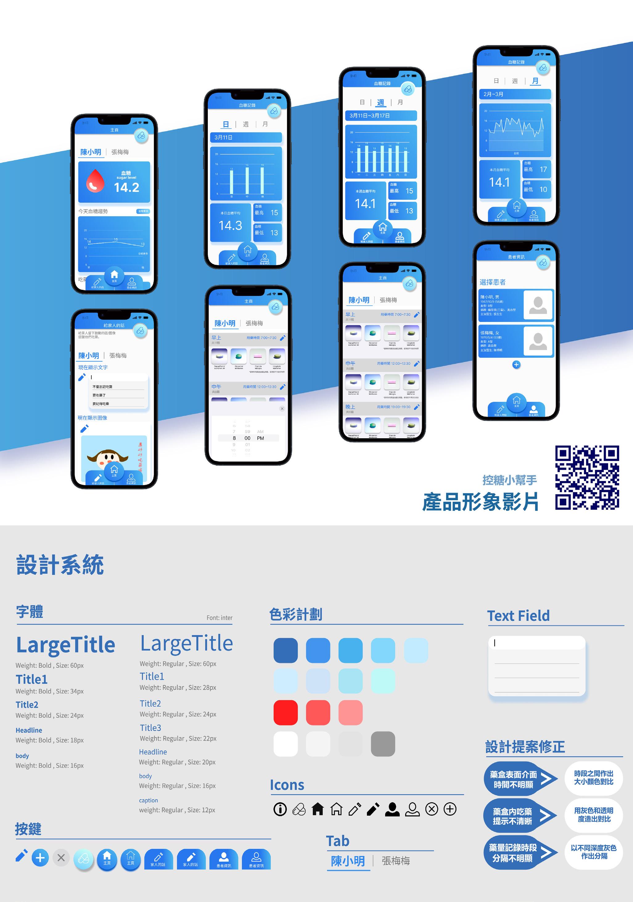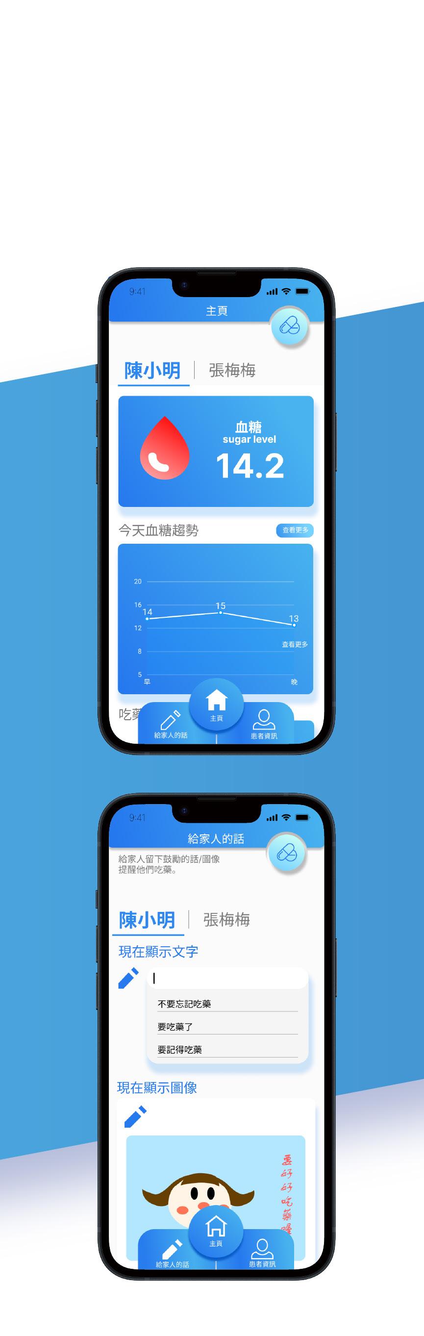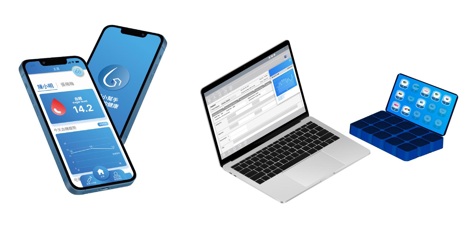 控糖小幫手是一款給合手機APP及智慧藥盒的產品。 藍色的漸層介面 及簡約易用的是這款產品的特色。