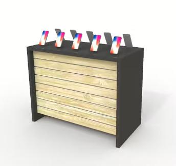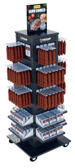 3Elevererarproduktställtill Tulipförderassortimentmedsalami. Ställenbeståravsvartakuberispårpanelmedsvartaspjut ochkorgar. Monteradelogorunt hela.