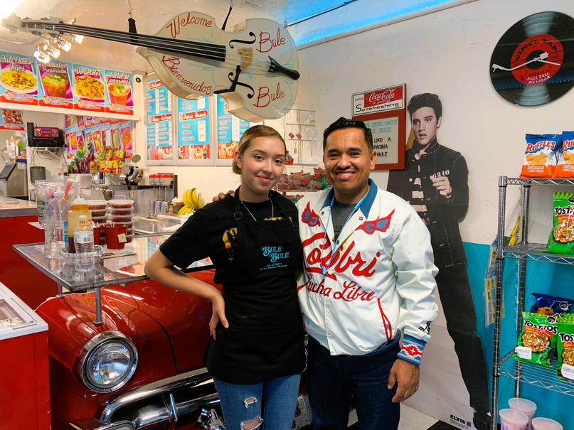 Bule Bule is a retro-themed neveria ran by Hector Soto and his daughters. Aside from ice-cream and milkshakes, Bule Bule also offers a wide range of food including candy, drinks, and traditional Mexican dishes. Hector and his family have always loved 50's/60's culture, especially when it comes to cars and music. In fact, the shop was named after "Bule Bule", a family favorite rock song by Los Apson. As soon as you walk in you will find all kinds of 50's diner décor. Especially the register counter, which is made from the front-end of a red Chevy Hector worked on! When asked if it was hard to work so close with family, Hector positively replied with "Oh no no no, not my daughters." He then explained how proud he was of himself and his daughters for working so hard. Together, Hector's family has created the most charming neveria in Westwood, and they will welcome you like you are a part of the family.