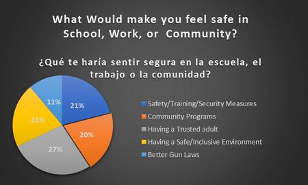 El Equipo de Liderazgo Juvenil de Southwest Vida ha creado un compromiso GVP (Prevención de la Violencia Armada) adaptado a diferentes grupos de edad: menores de 13 años, jóvenes de 14 a 24 años y adultos de 25 años o más. Este compromiso tiene una serie de compromisos basados en la categoría de edad, que van desde fomentar la educación personal sobre la violencia armada hasta denunciar cualquier posesión no autorizada de armas de fuego por parte de conocidos a adultos de confianza. La implementación del compromiso GVP comenzó dentro de la Comunidad del Suroeste de Denver en mayo de 2023 y continuará hasta la conclusión del verano de 2023. Esta iniciativa se está presentando en eventos locales en todo el suroeste de Denver. Una pregunta común que se encuentra en todas las versiones de compromiso es: "¿Qué medidas te haría sentir una sensación de seguridad en la escuela, el trabajo o la comunidad?" Las respuestas están a continuación.
