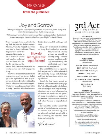 delight: Your love of life and mega-watt smile. Being alive means much more than not being dead. And unless we are in the process of actively dying, we should be actively living—a lesson my dad taught me well. Age means nothing. We are limited only by our motivation and imagination. That said, 2020 has been an especially difficult year—we’ve all been knocked off balance by change and challenge and loss. So how do we regain our equilibrium? I think Dr. Eric Larson sums it up best with his Albert Einstein quote (page 22), “Life is like riding a bicycle. To keep your balance you must keep moving.” More than ever, we need to keep moving our bodies, our minds, and our spirits. We need to nurture our curiosity, our wonder, and our connection with each other. We need to forgive but not forget. Let’s enter this holiday season with a spirit of possibilities and optimism. It’s time to pick ourselves up, dust ourselves off, and look ahead. A New Year is dawning, and we have a lot of living and work to do.