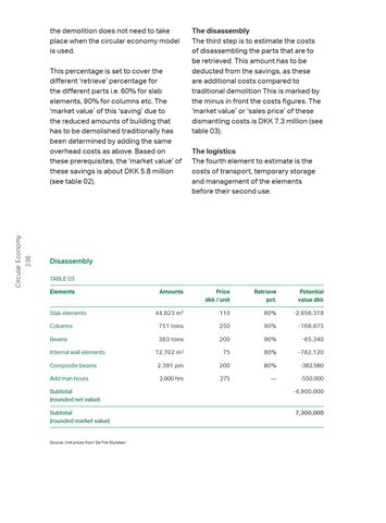 The disassembly The third step is to estimate the costs of disassembling the parts that are to be retrieved. This amount has to be deducted from the savings, as these are additional costs compared to traditional demolition This is marked by the minus in front the costs figures. The ‘market value’ or ‘sales price’ of these dismantling costs is DKK 7.3 million (see table 03). The logistics The fourth element to estimate is the costs of transport, temporary storage and management of the elements before their second use.