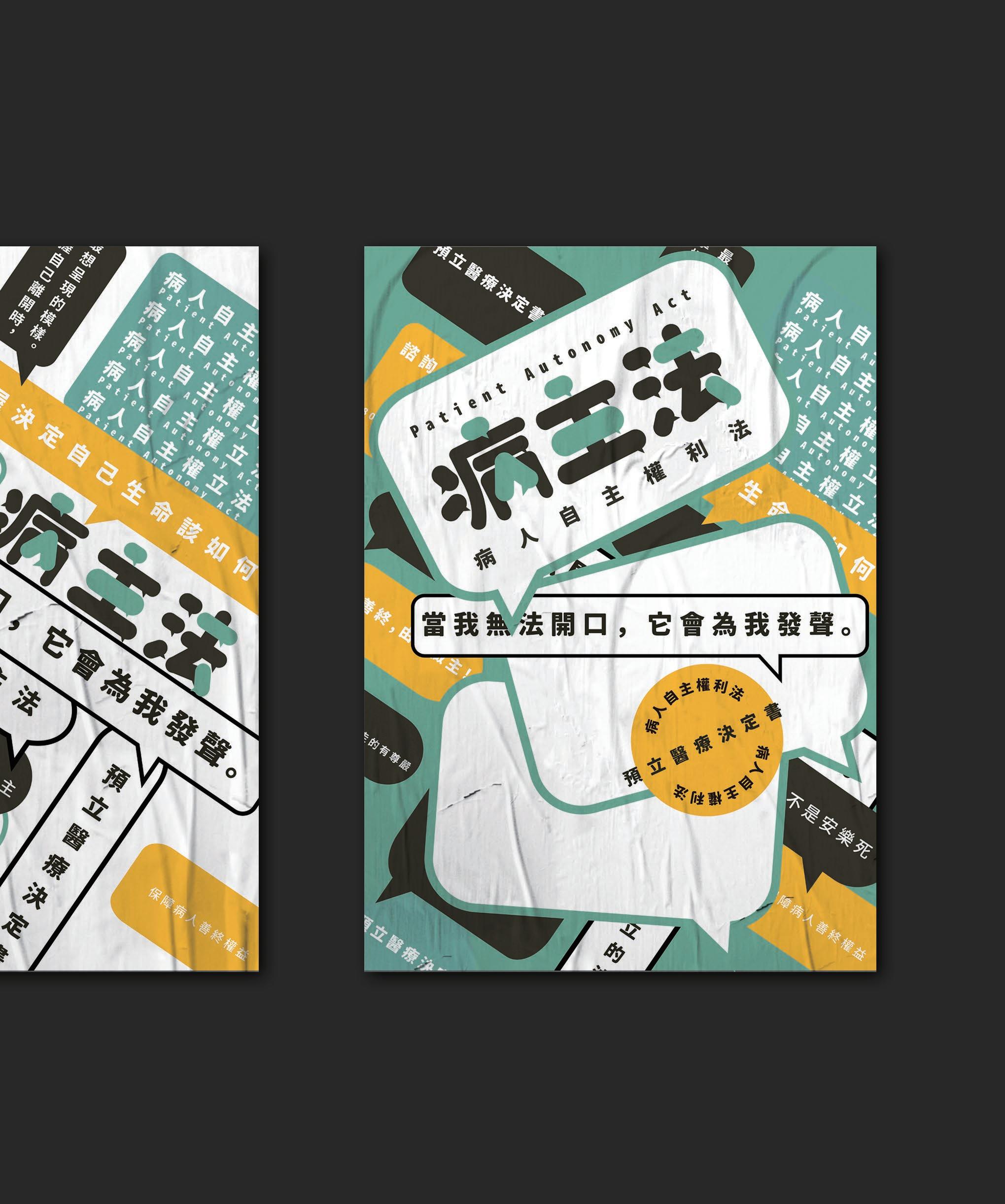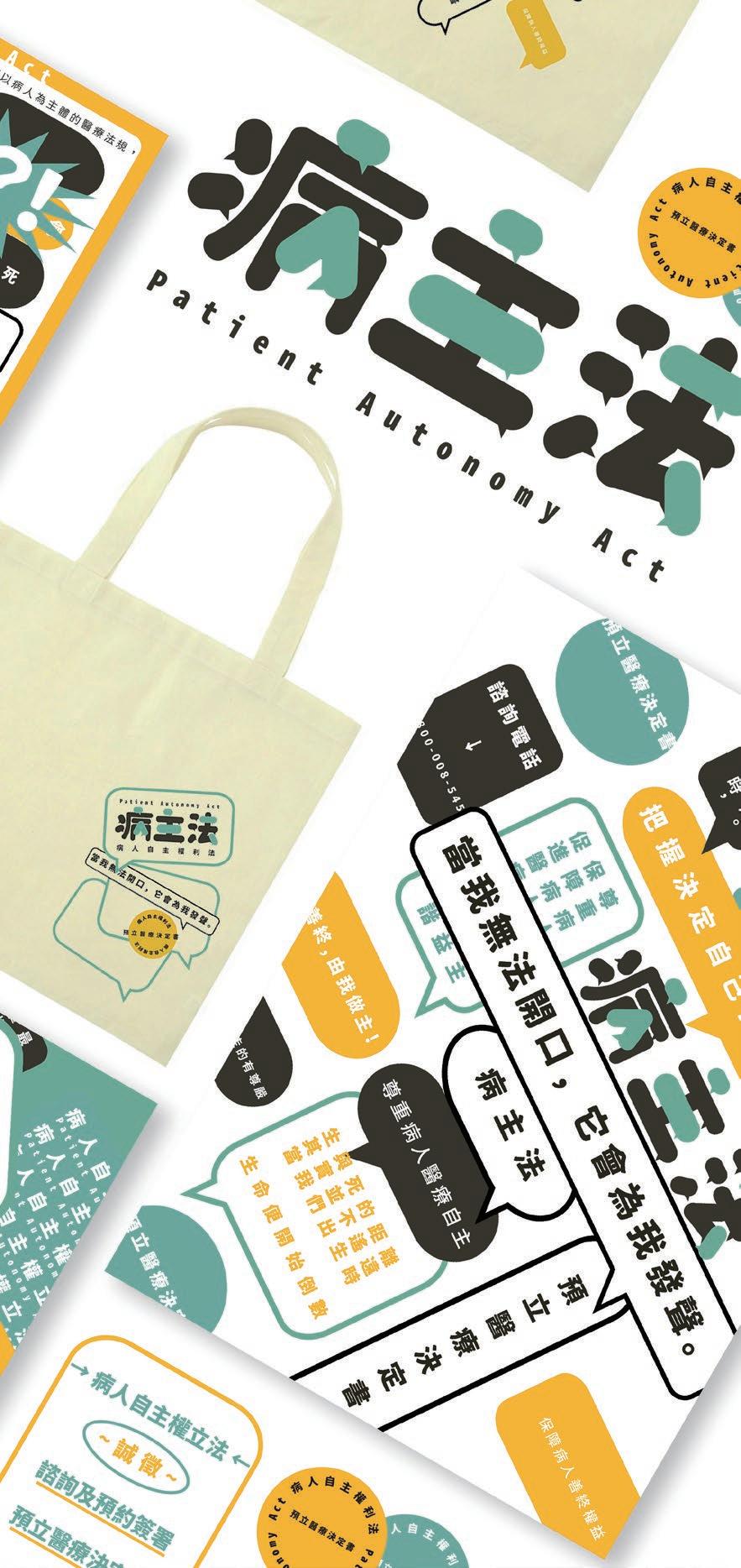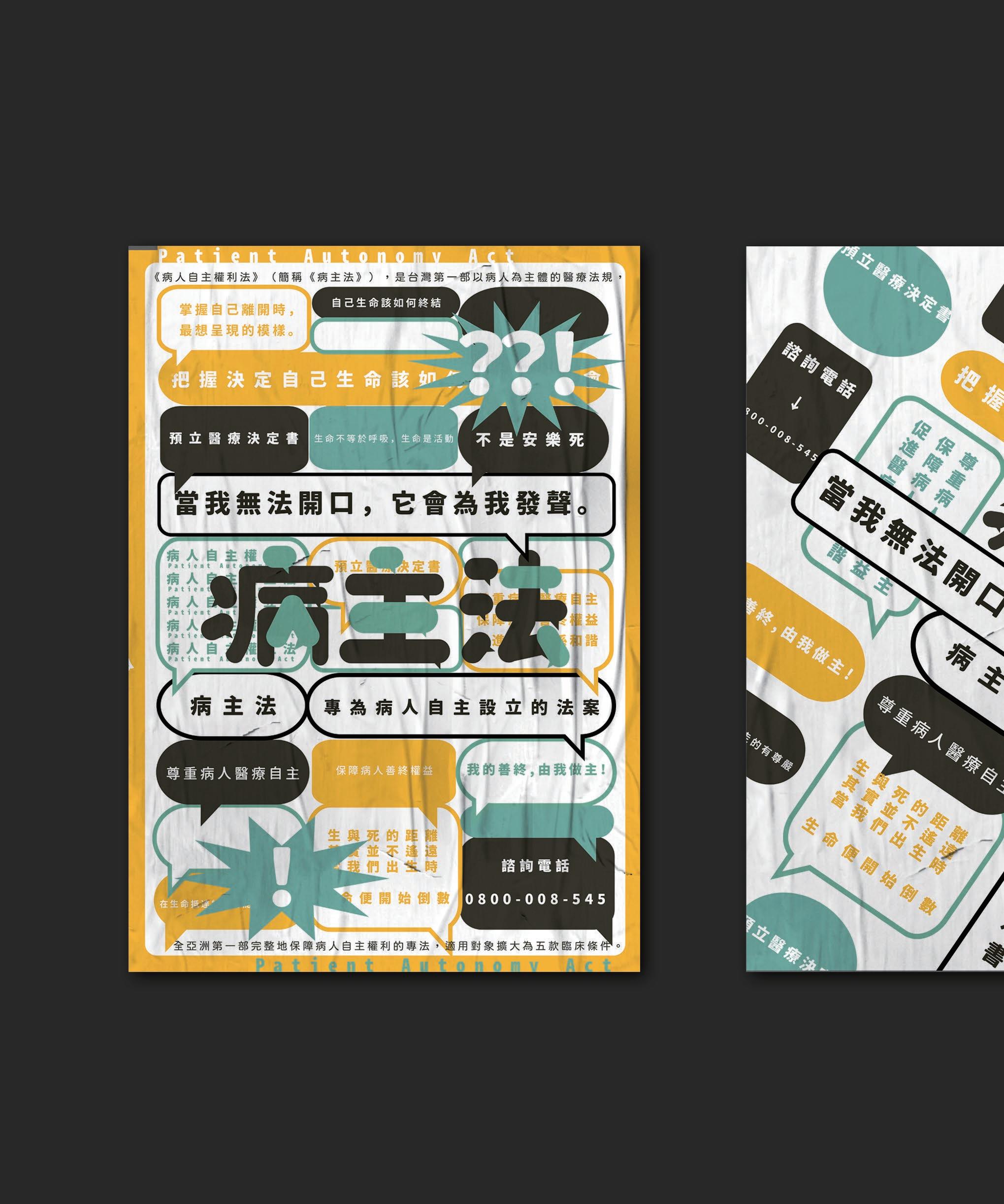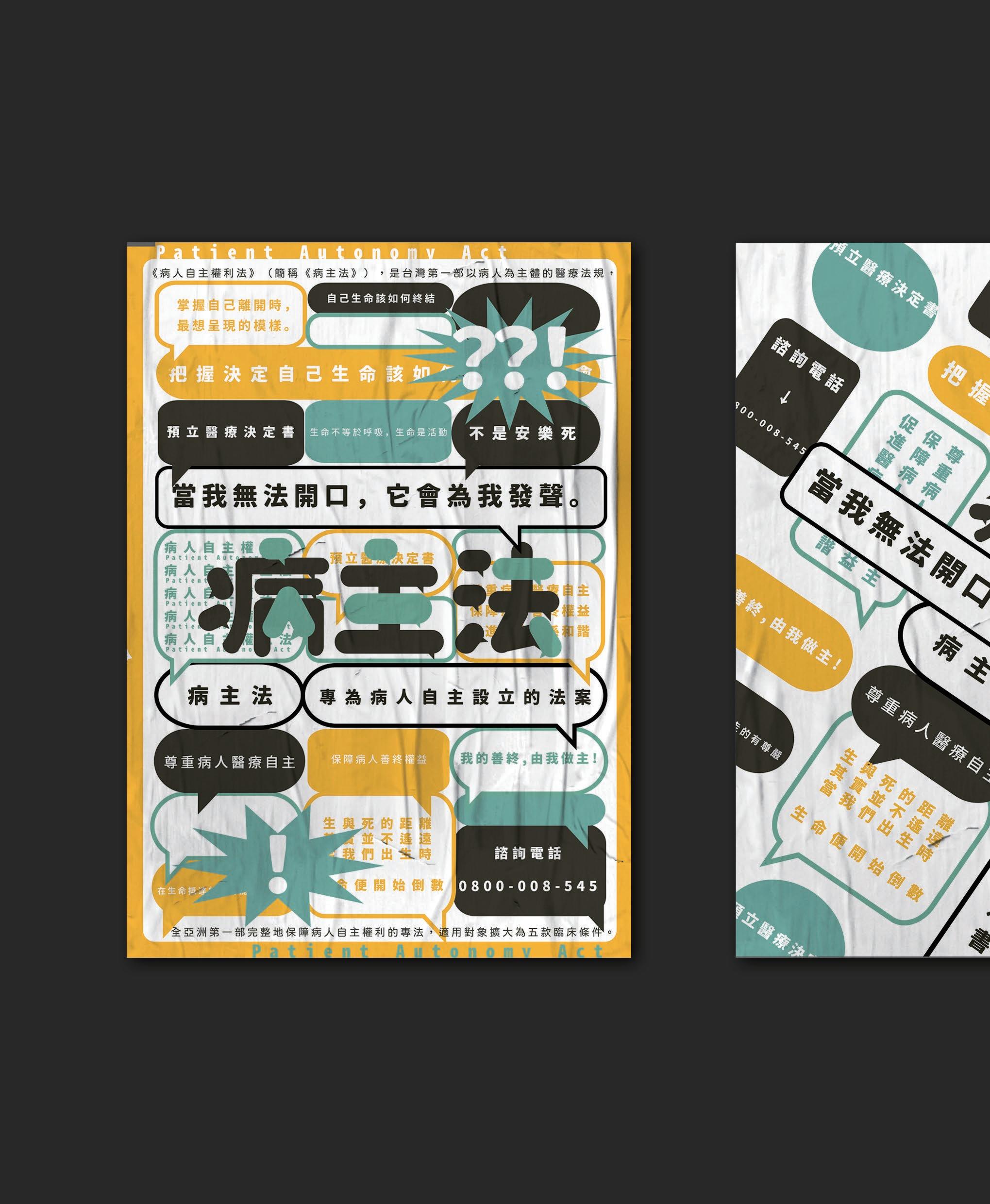 由於病人自主權利法是在 2015年通過,且經過修改後在近年 才開始實施,因此大眾對於病主法 可說是相當陌生,或從未聽聞,而 這可能讓面臨到這種狀況的家屬以 及病人還有一般社會大眾根本不知 道這個法案以至於無法使用,我們 藉由海報及相關周邊設計能夠推廣 讓更多人能夠知道甚至去搜尋並理 解然後告知需要的人去使用它。 當我無法開口, 它會為我發聲。