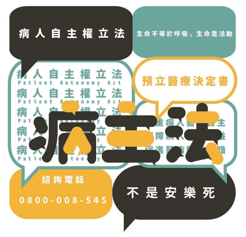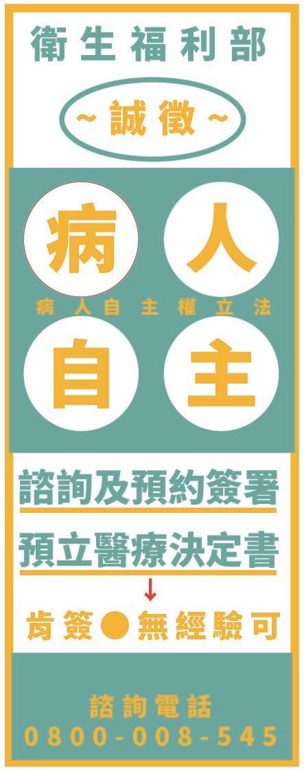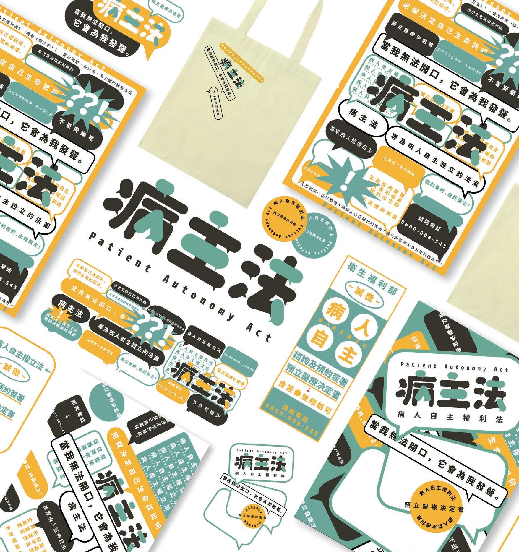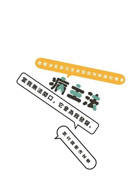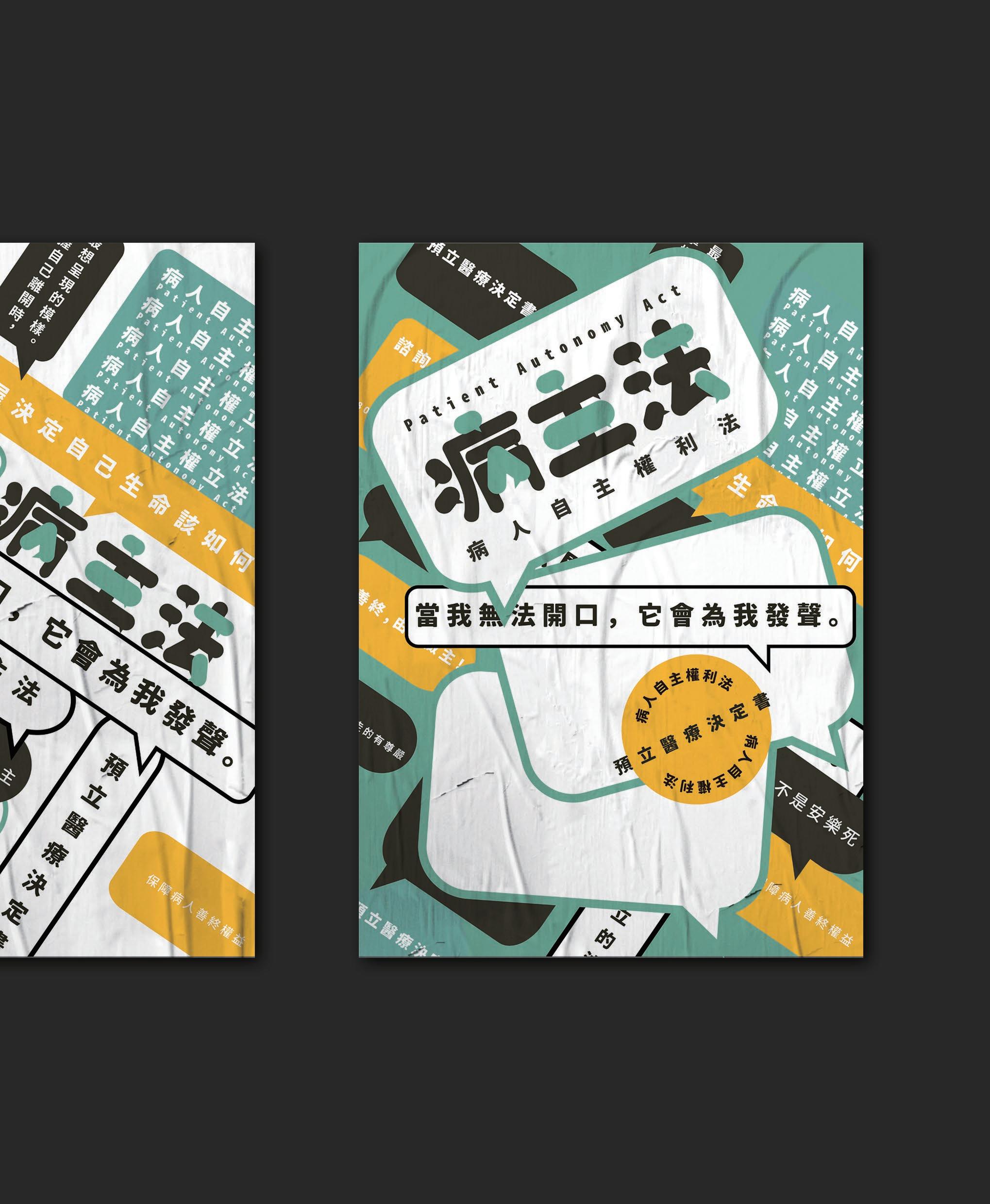 由於病人自主權利法是在 2015年通過,且經過修改後在近年 才開始實施,因此大眾對於病主法 可說是相當陌生,或從未聽聞,而 這可能讓面臨到這種狀況的家屬以 及病人還有一般社會大眾根本不知 道這個法案以至於無法使用,我們 藉由海報及相關周邊設計能夠推廣 讓更多人能夠知道甚至去搜尋並理 解然後告知需要的人去使用它。 當我無法開口, 它會為我發聲。