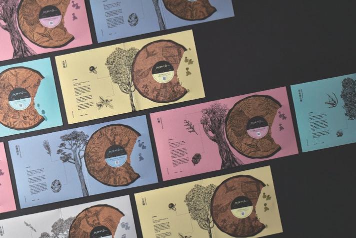 畢業製作 栩栩如森 張家語 李敏瑄 曾以樺 潘亮竹 蔡依澐 33 Lively Voices of the Woods 設計手法作品理念 和它的環境音效,讓人可以身歷其中。且在黑膠中心上放上QR境,黑膠則是以樹木第一人稱的視角,使用俯視構圖,在一圈圈年輪上刻畫它的生長,並根據不同的樹種畫出其周遭環境。外包裝是以第三人稱的視角,用仰視去看它的外在環讓人們可以了解樹木。而在整體包裝上,我們使用黑膠造型的刊物呈現,製作成有聲書,更多迴響。我們透過一片片年輪造型的有聲刊物,讓這些環境音在樹木與人之間相互傳遞,希望得到如果我們是樹,會有怎麼樣的故事想分享?樹究竟會聽見什麼聲音呢?整體設計中我們收錄了樹木生長環境的聲音,並以圖像加以記錄了樹木的生長環境,Code的圖樣,用手機掃描便會出現影片,可看到該棵樹的年輪