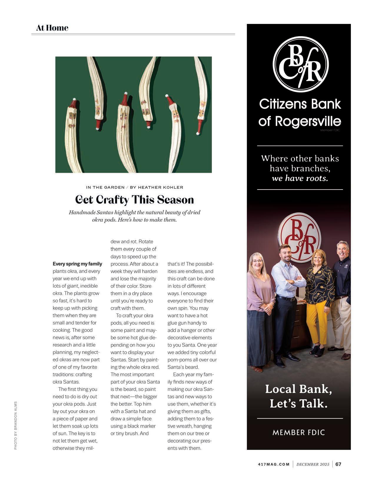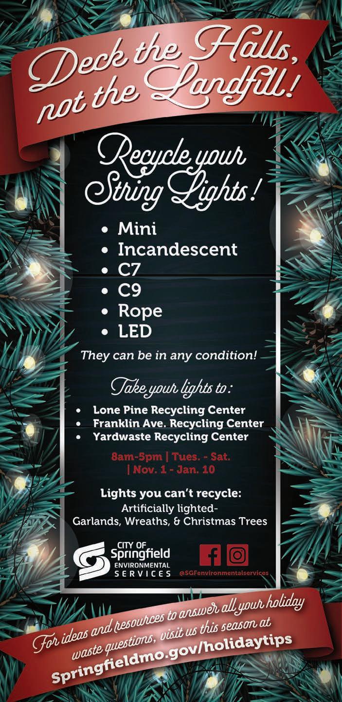 Still have an empty space in your living room where the Christmas tree should be? Check out our list of places where you can nd a natural Christmas tree around the Ozarks at 417mag.com/treefarms. Plus, keep 417mag.com/recycletrees handy after the holidays so you can nd the right place to recycle or dispose of your tree when the time comes, too.