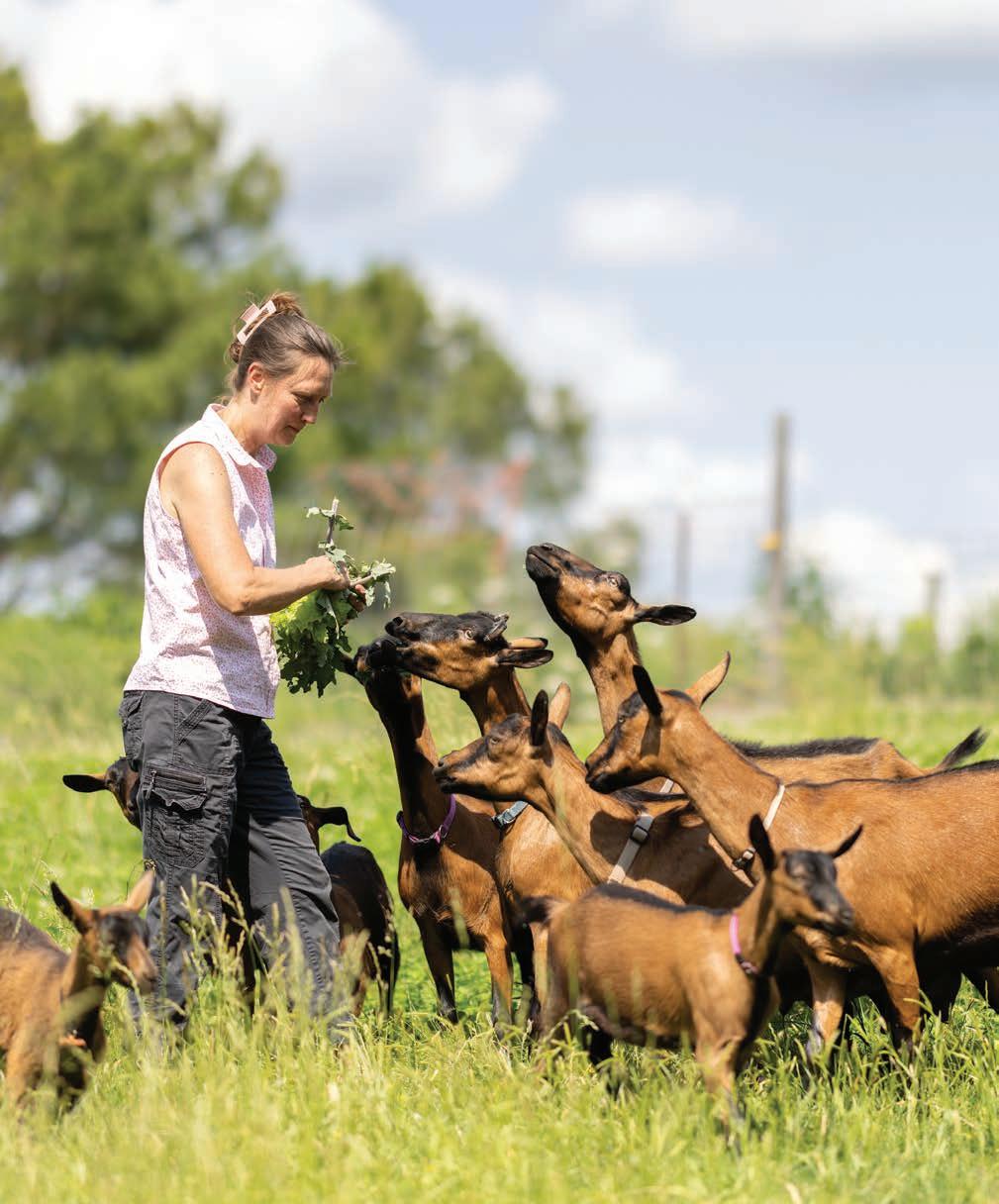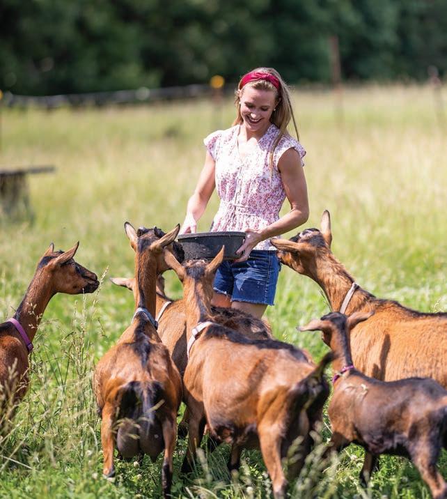 IT’S JUST A QUICK WALK across the road from the Hood family’s home in Walnut Shade to their barn full of American Heritage Oberhasli goats and milking barn. MaryBeth Hood, along with her husband Paul Hood and their children, has created a home and property where they can spend their days raising their goats and chickens; growing a variety of vegetables, herbs and owers; tending to their small orchards; making artisan goat milk soap; and teach-