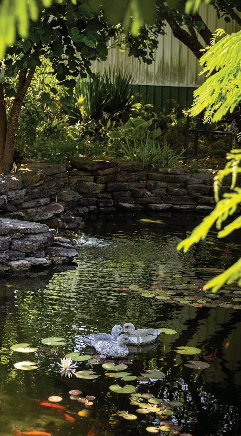 With its combination of contemporary and antique touches, the garden at Pat and Alan Ware’s home makes you feel like you’re stepping into an elusive time period. Here, heirloom perennials surround a zen-like pond. Crossing over the pond’s bridge, you can peer down and see oating water lilies and timeworn statues. It’s like a real-life setting of the classic Victorian novel The Secret Garden