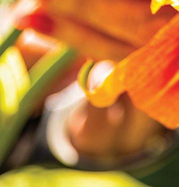 Each year, Amy tries to plant a few new vegetables and owers and several repeats. Some of her go-to owers are zinnias and sun owers. “Zinnias are so easy to grow because they are really tolerant, and sun owers are so dramatic and have a magical feel when they get so big,” Amy says. The Taylors always include herbs in their garden to garnish drinks and even use as greenery in bouquets.