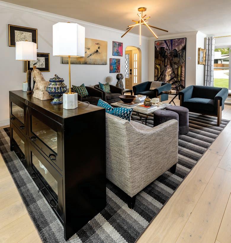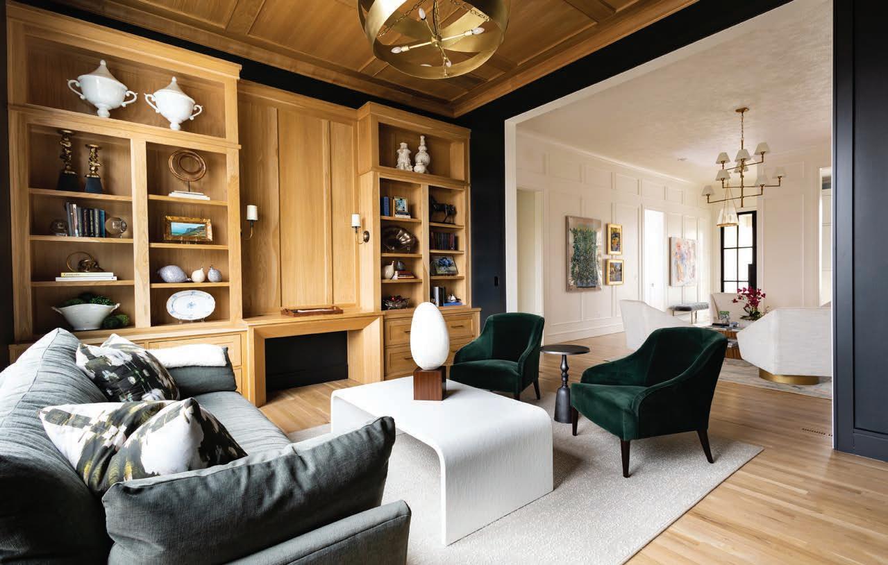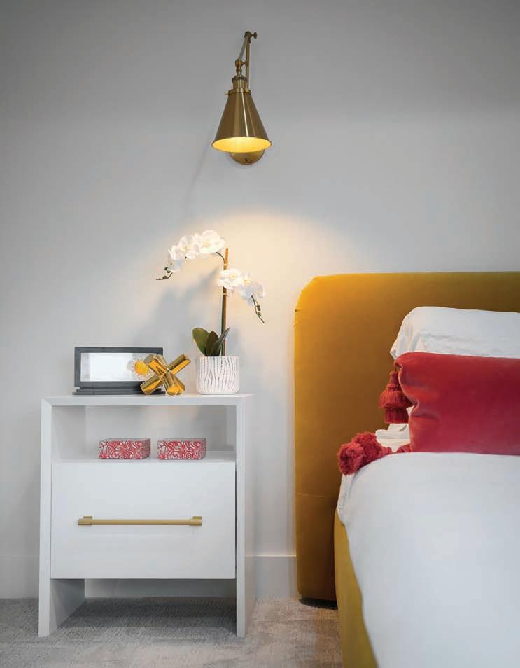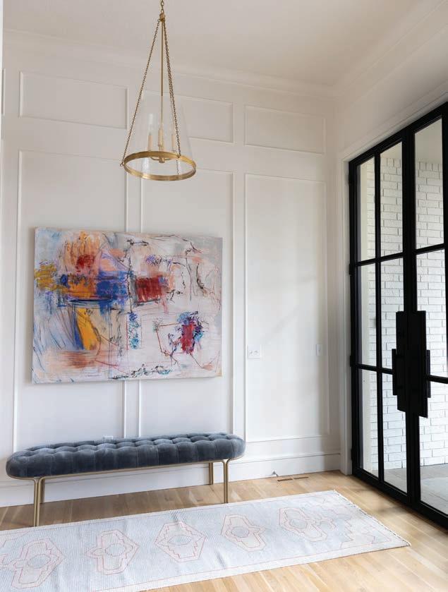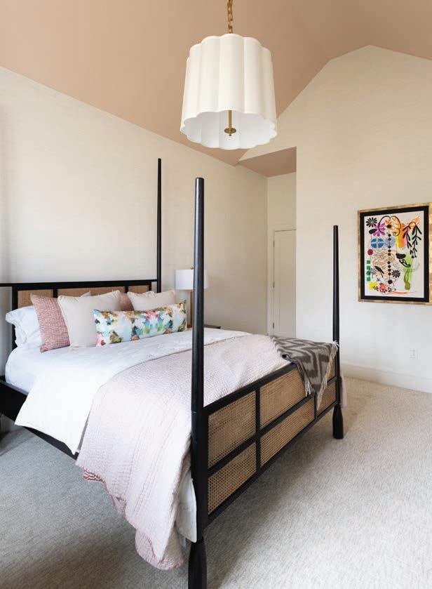 “This family wanted a timeless space, but they also wanted a pop of color,” Edwards says. “There are things in the room that you’re definitely not going to change often, and one of those things is the carpet and another is the light fixtures. So it was impor tant for me to create a neutral palette and then bring in pops of color in other ways.”