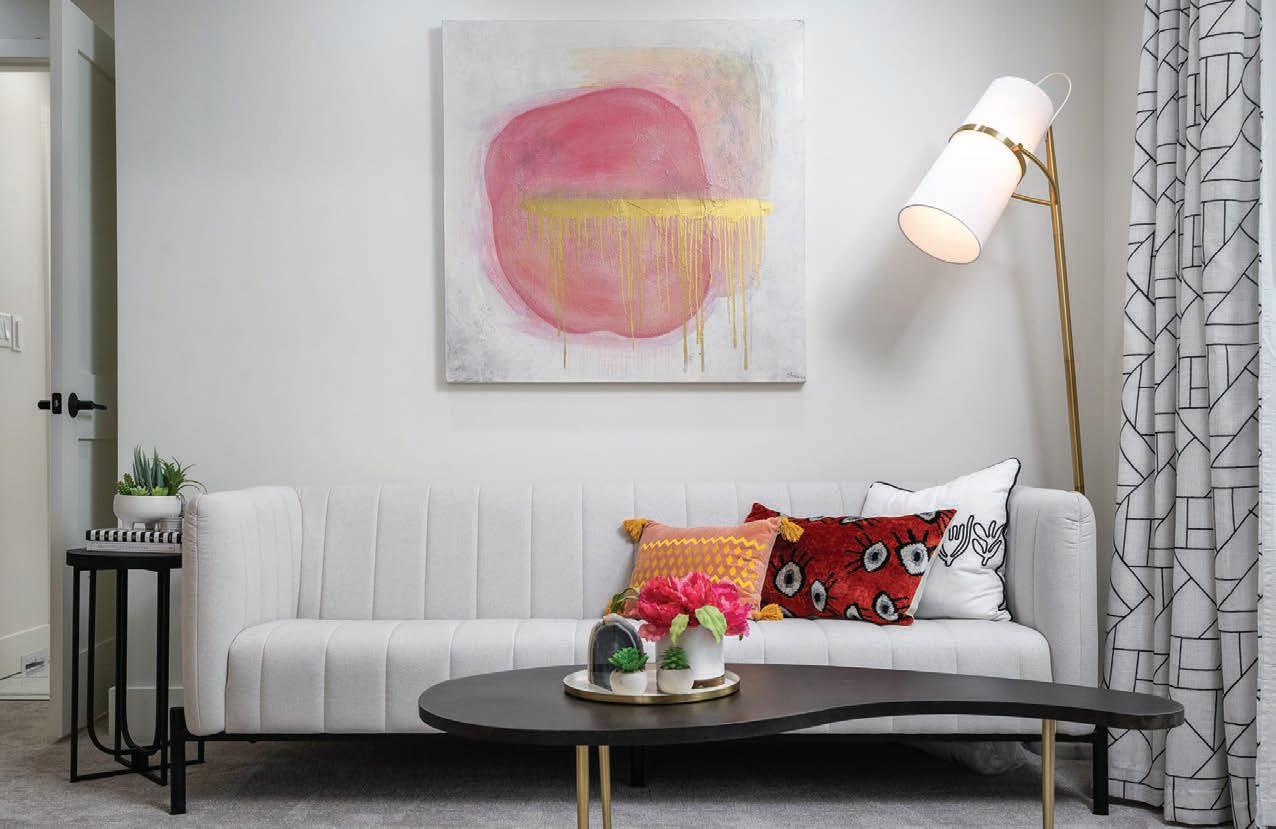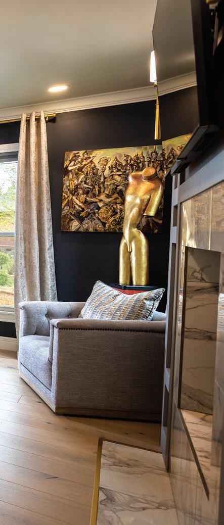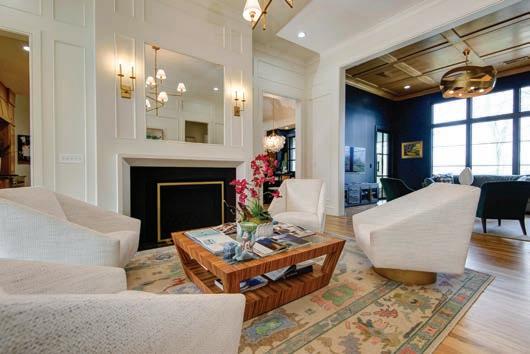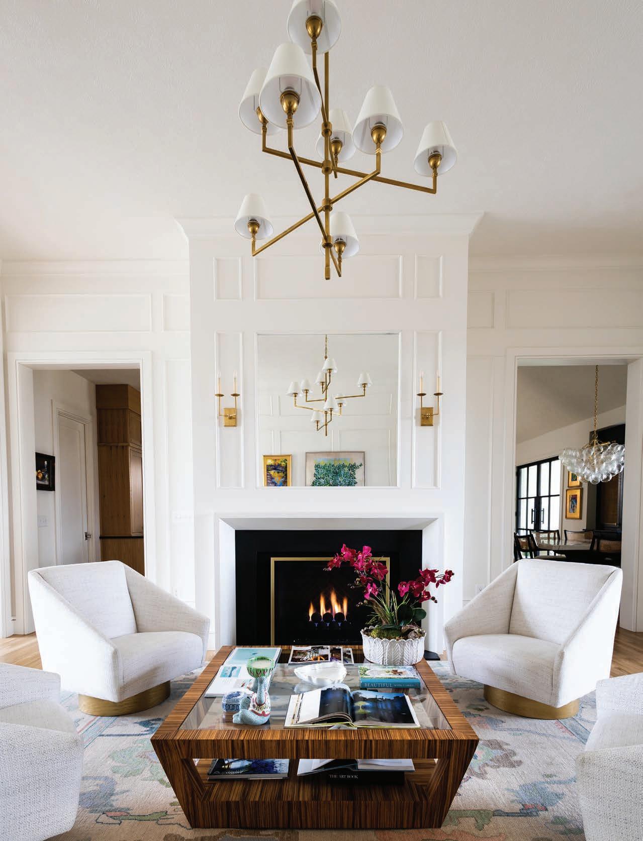 “This family wanted a timeless space, but they also wanted a pop of color,” Edwards says. “There are things in the room that you’re definitely not going to change often, and one of those things is the carpet and another is the light fixtures. So it was impor tant for me to create a neutral palette and then bring in pops of color in other ways.”