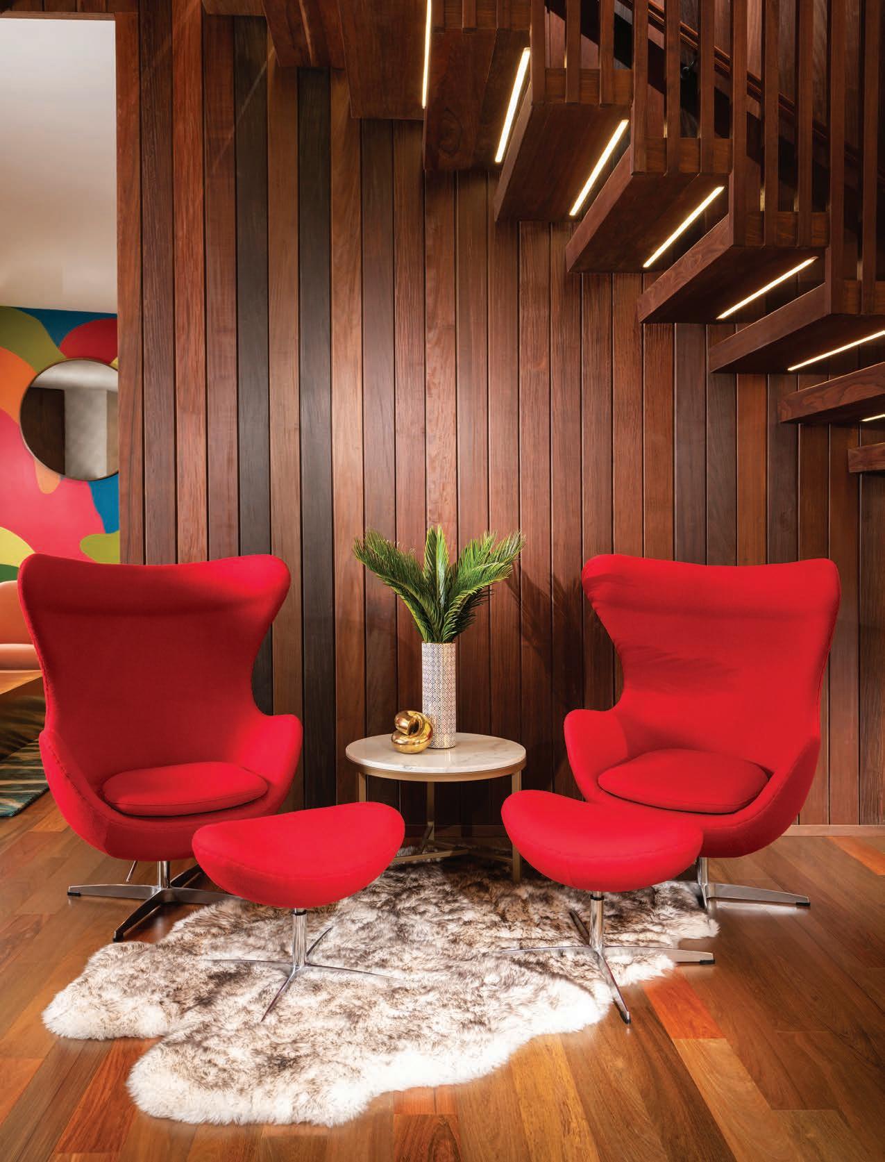 Underneath the stairwell provided a perfect place for a reading nook, complete with a couple of cherry-hued chairs that are equal parts stylish and cozy. The two daughters often stake this spot as theirs and love to curl up with books selected from the family’s library that sits conveniently across the way.