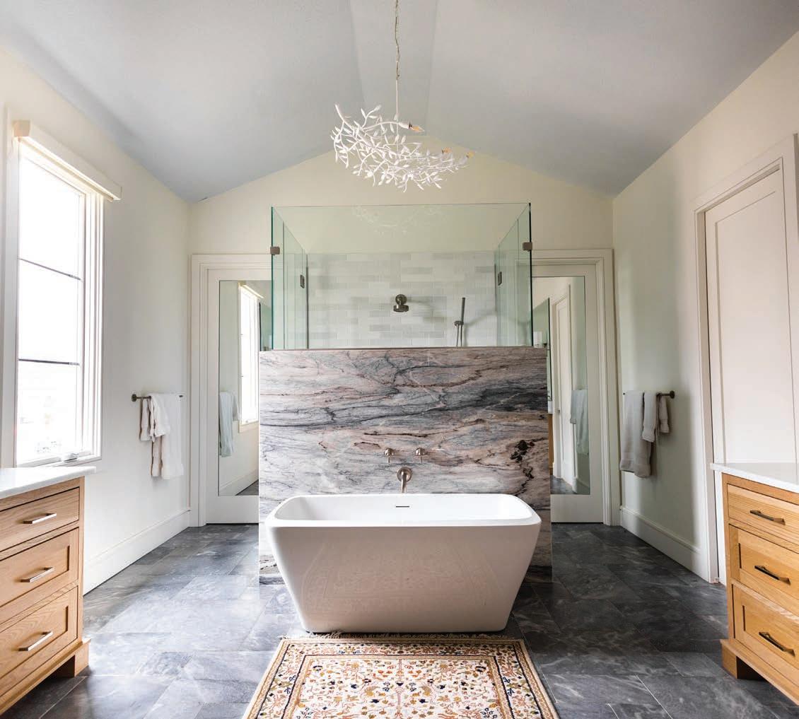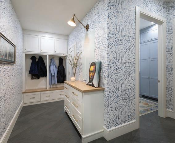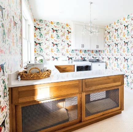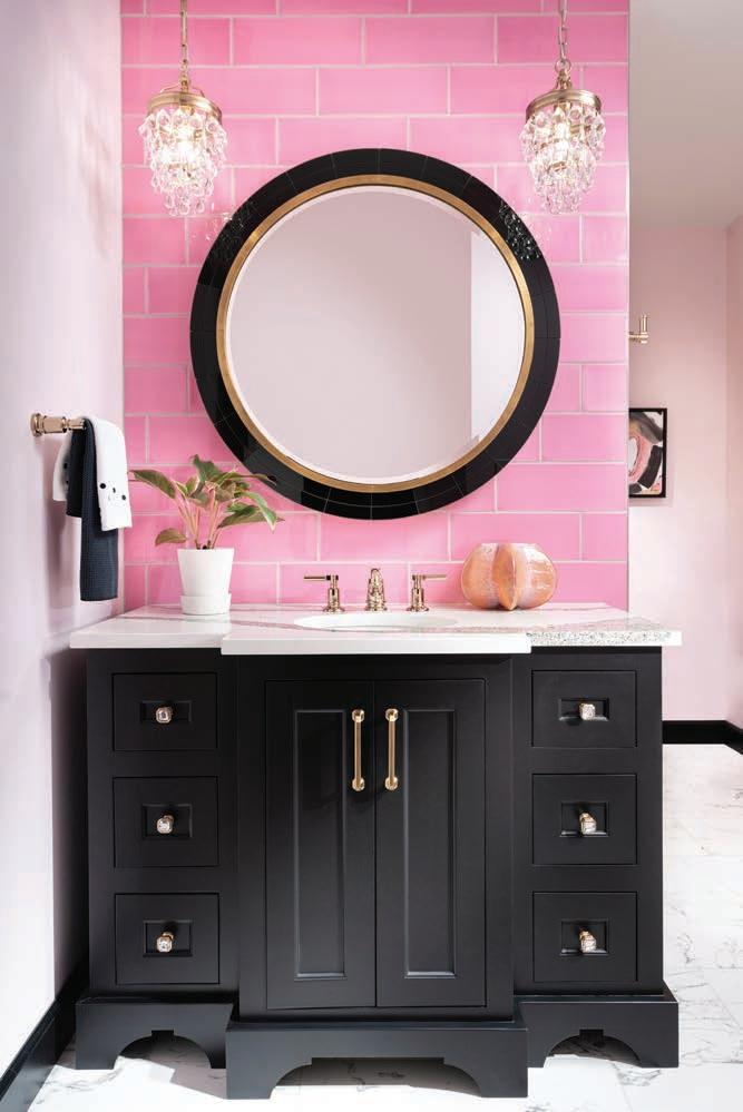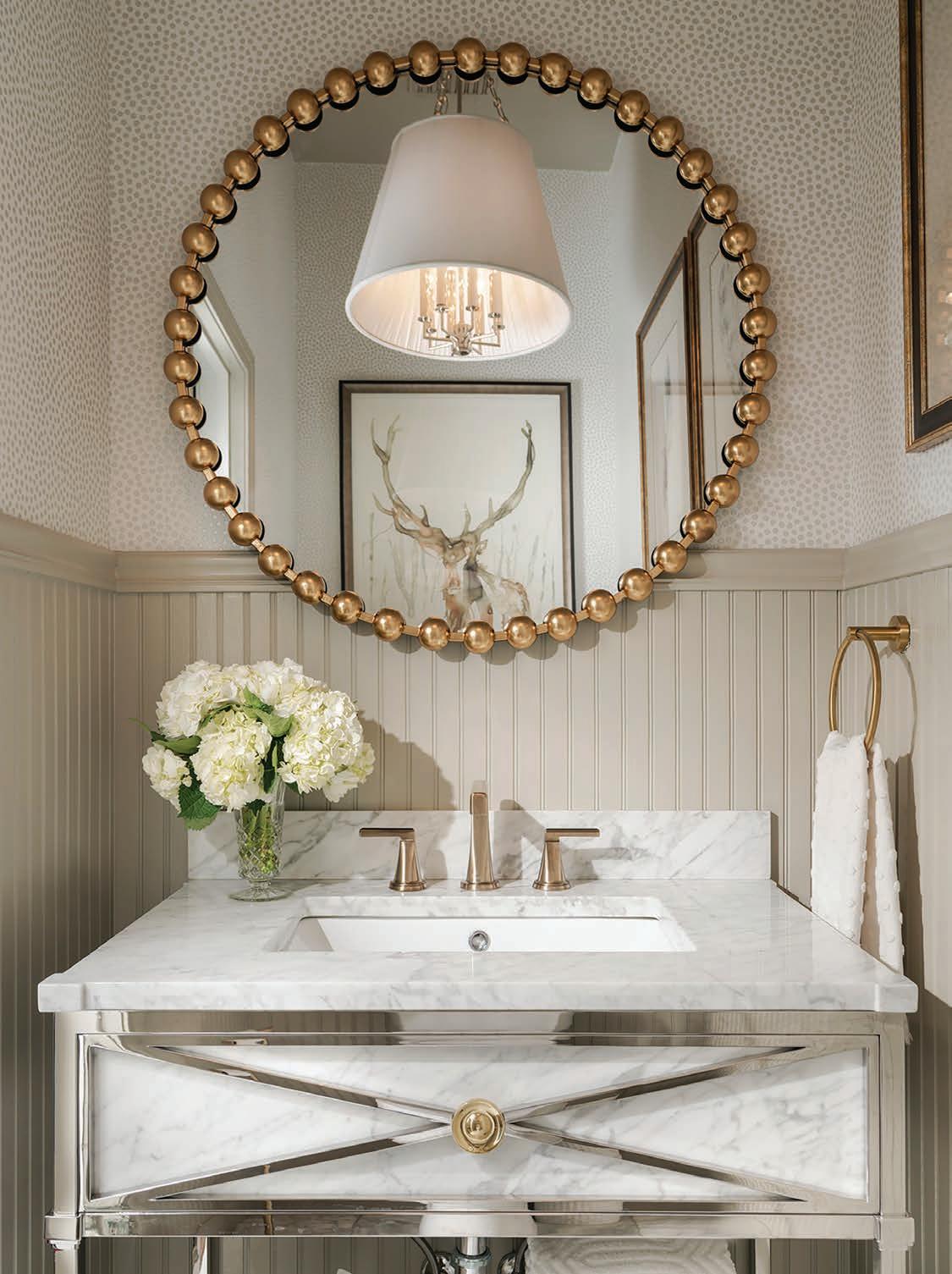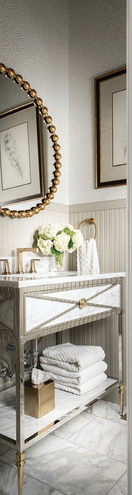 The accessories and patterns Taylor brought together in this project create a timelessly elegant space that doesn’t take itself too seriously. A watercolor portrait of a deer and neutral animal print wallpaper combine classic with whimsical. Mixing metals is one of Taylor’s signature design touches, so glimmers of gold next to nickel break the traditional mold via the vanity, faucet, mirror and light fixture. “Our idea was to create a toneon-tone color scheme with just a little bit of the reflectivity of gold,” he says.