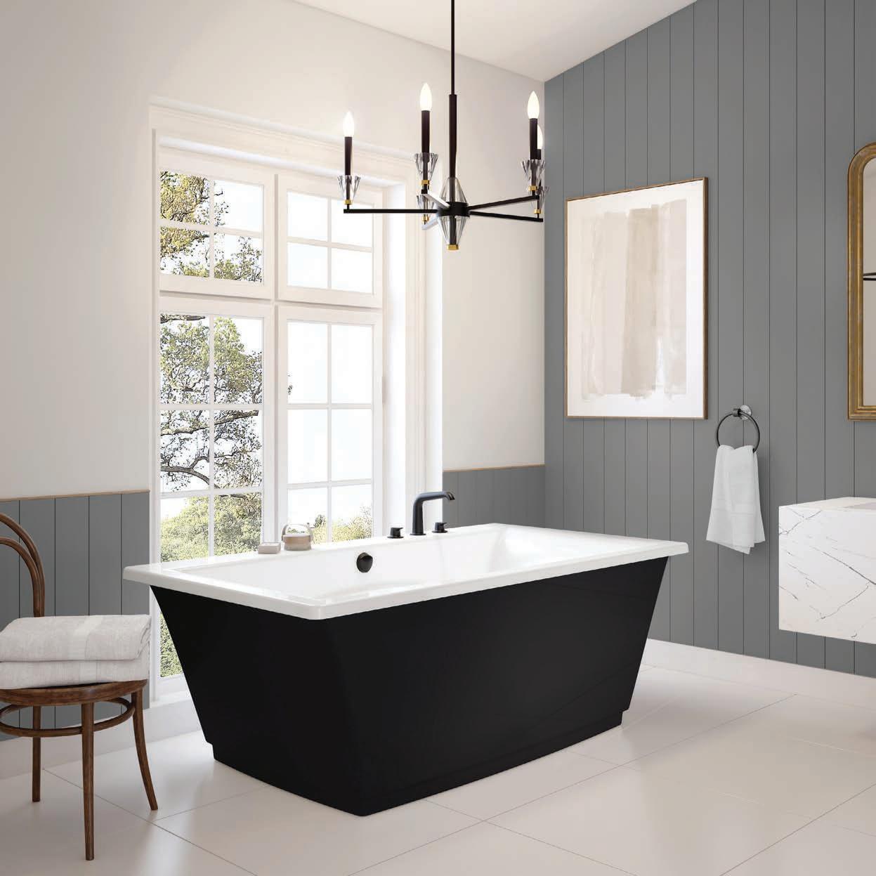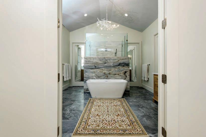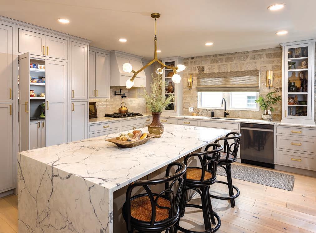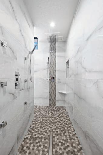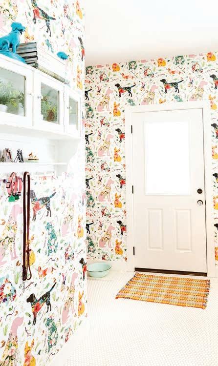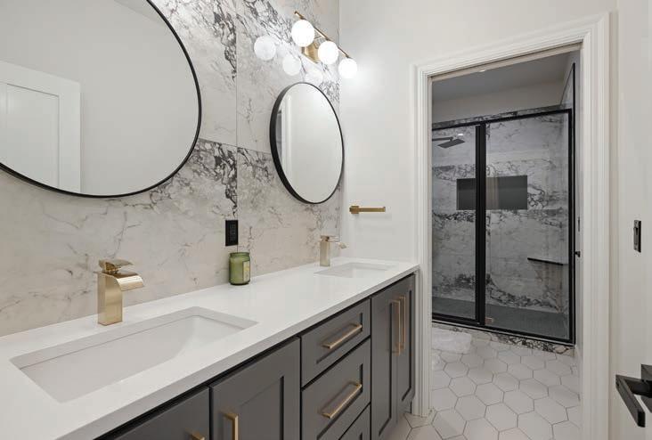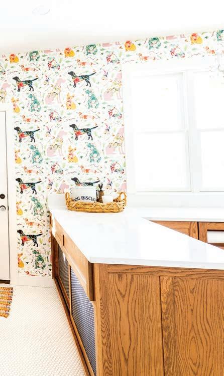 The accessories and patterns Taylor brought together in this project create a timelessly elegant space that doesn’t take itself too seriously. A watercolor portrait of a deer and neutral animal print wallpaper combine classic with whimsical. Mixing metals is one of Taylor’s signature design touches, so glimmers of gold next to nickel break the traditional mold via the vanity, faucet, mirror and light fixture. “Our idea was to create a toneon-tone color scheme with just a little bit of the reflectivity of gold,” he says.