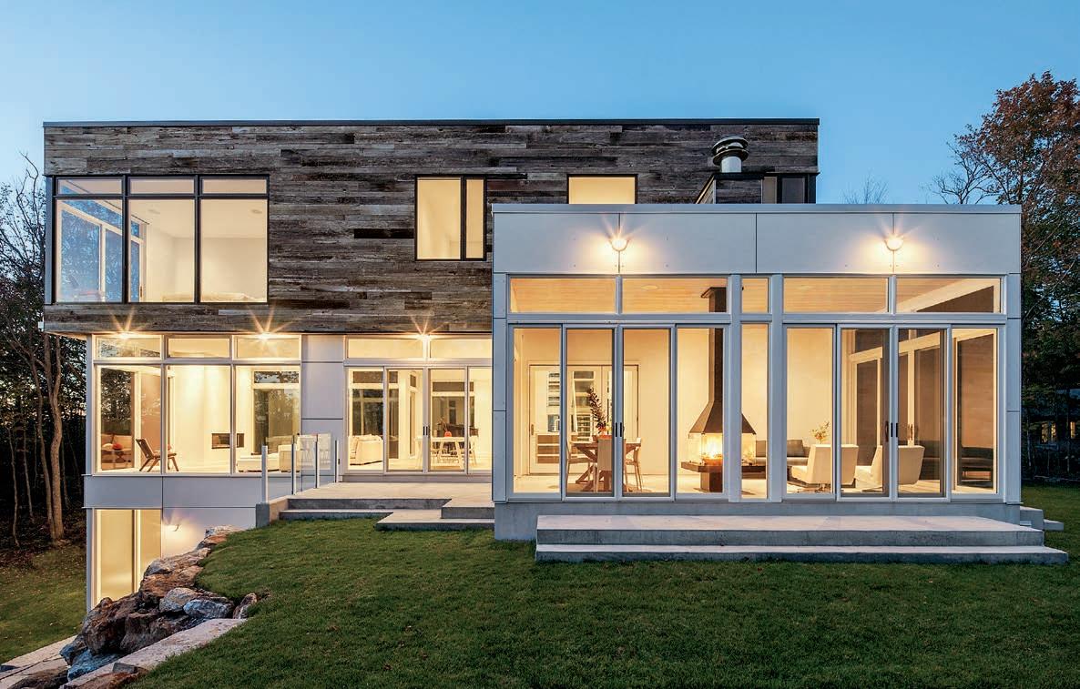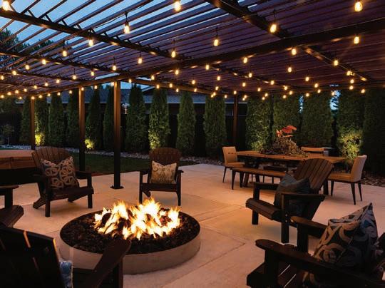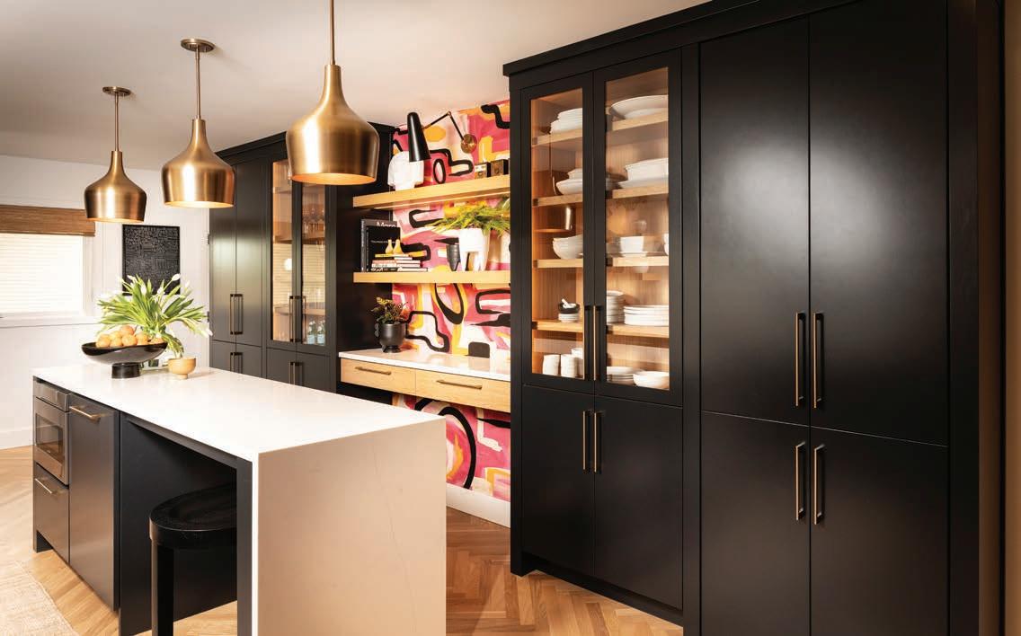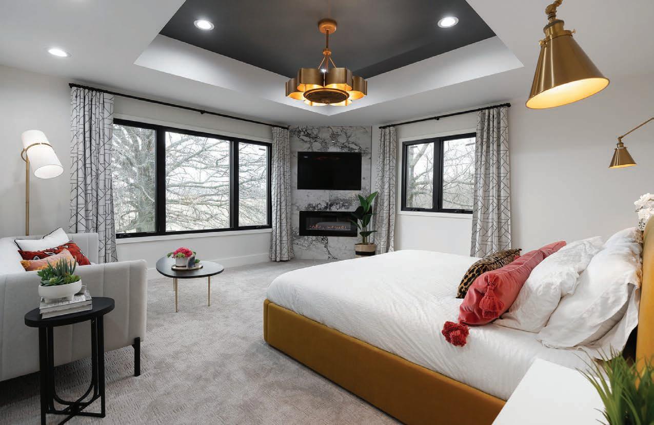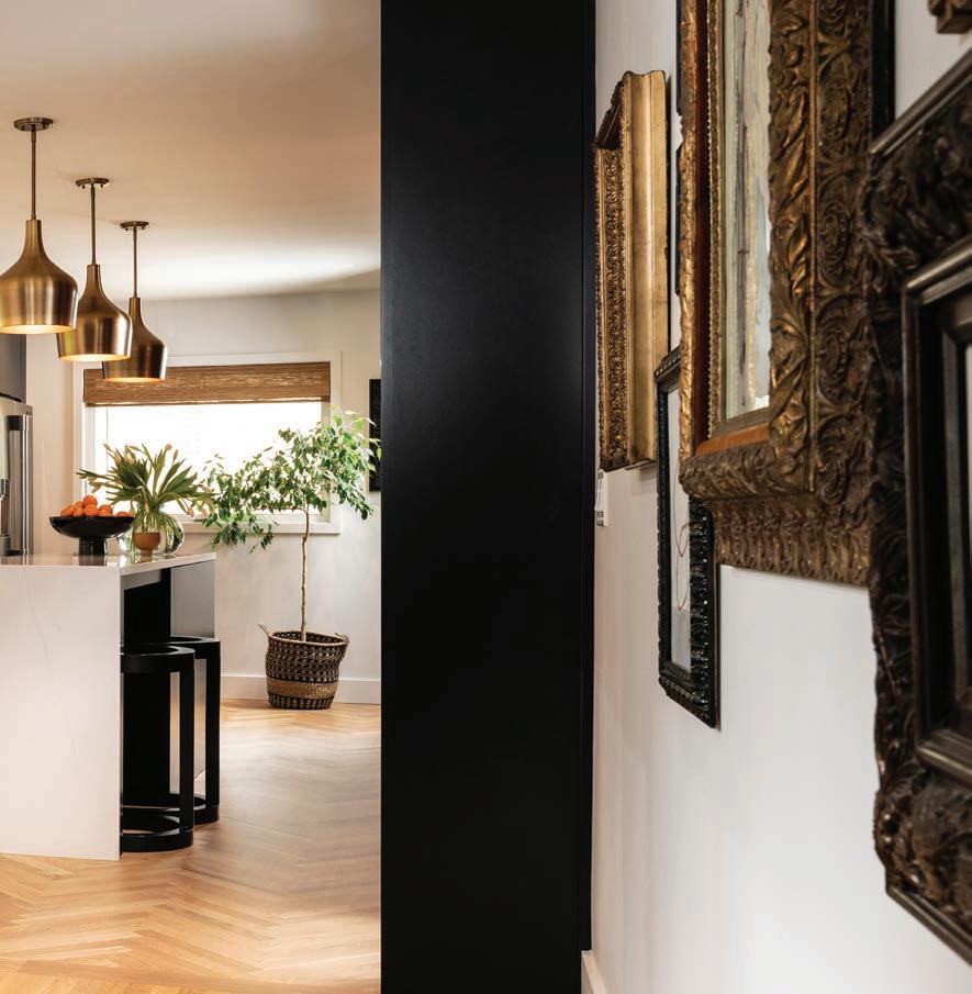 Designing this walk out basement was a balancing act for Nathan Taylor, principal designer and owner at Obelisk Home. He knew this open space must cater to the R&R needs of a couple and their two daughters. Additionally, he wanted to combine the wife’s traditional taste with the husband’s contemporary taste. The end result became three separate living spaces within one. The main seating area features a comfortable-yet-sleek oversized sectional and bold green leather chairs (pictured p. 57), while an antique replica rug anchors it all. Right behind this spot lies a secondary seating area, ideal for a fireside conversation and a cocktail conveniently made at the downstairs bar. The