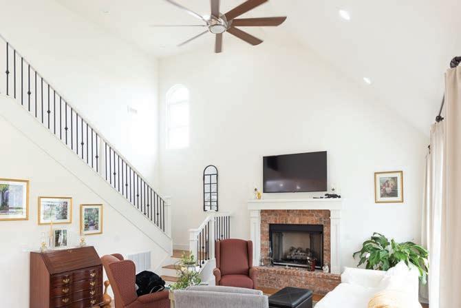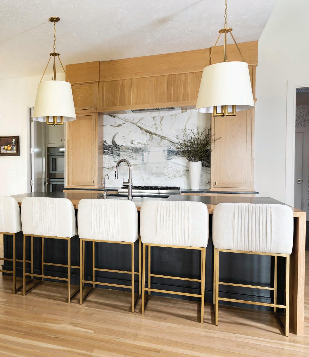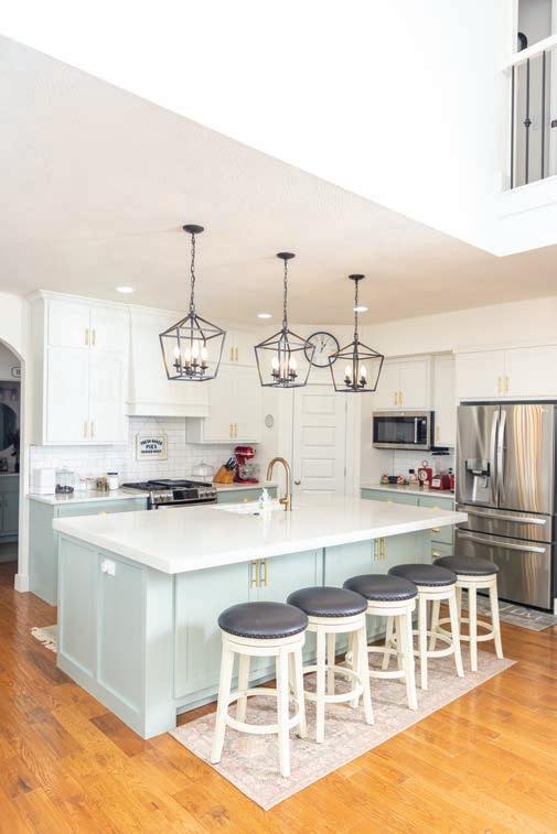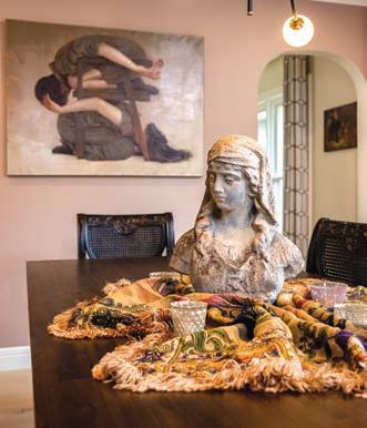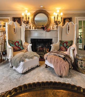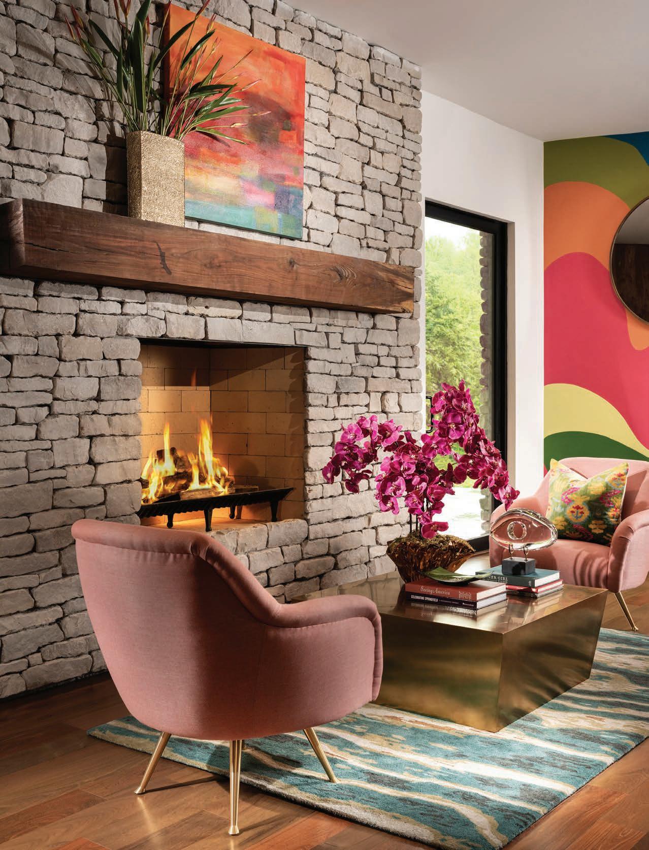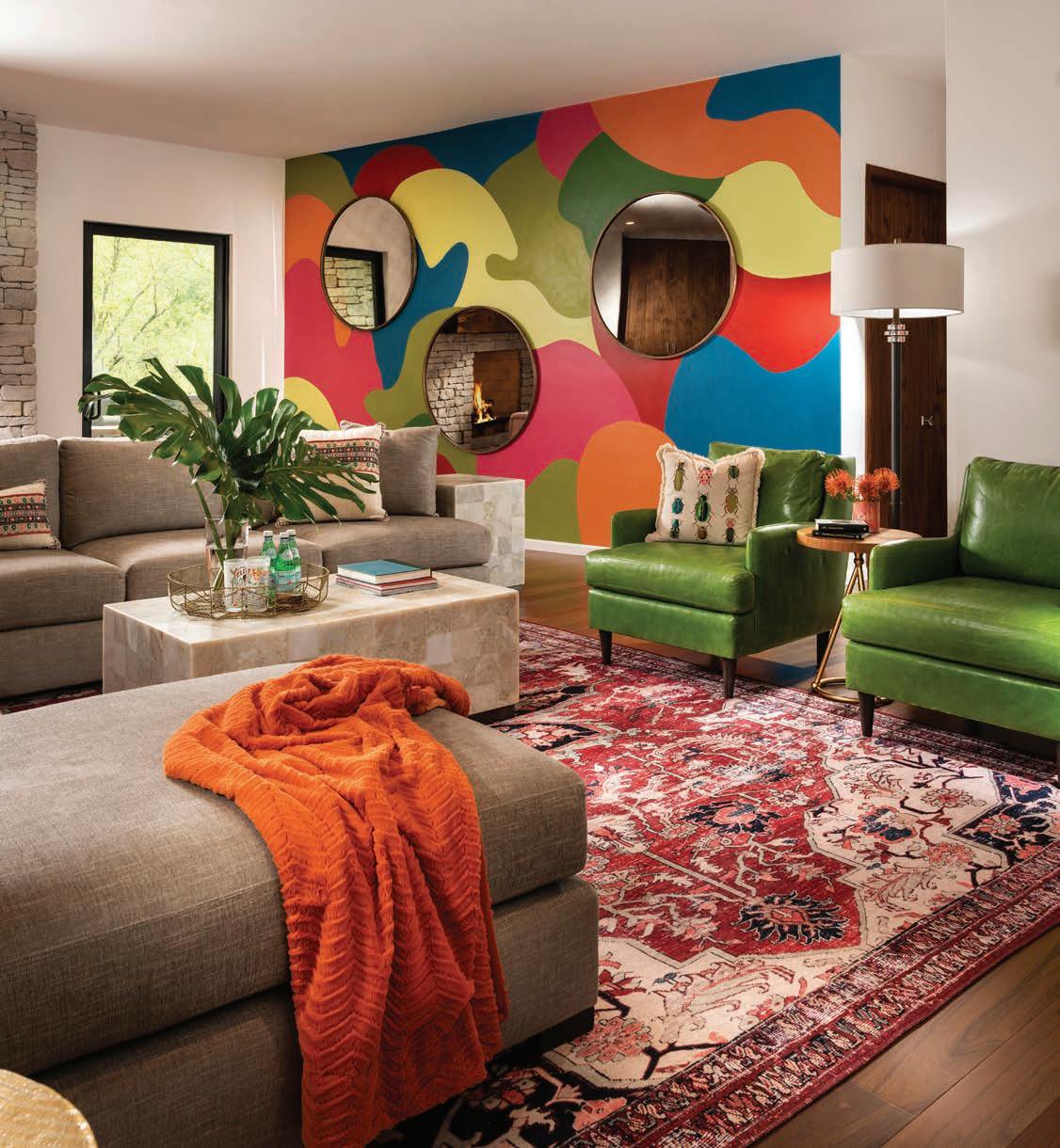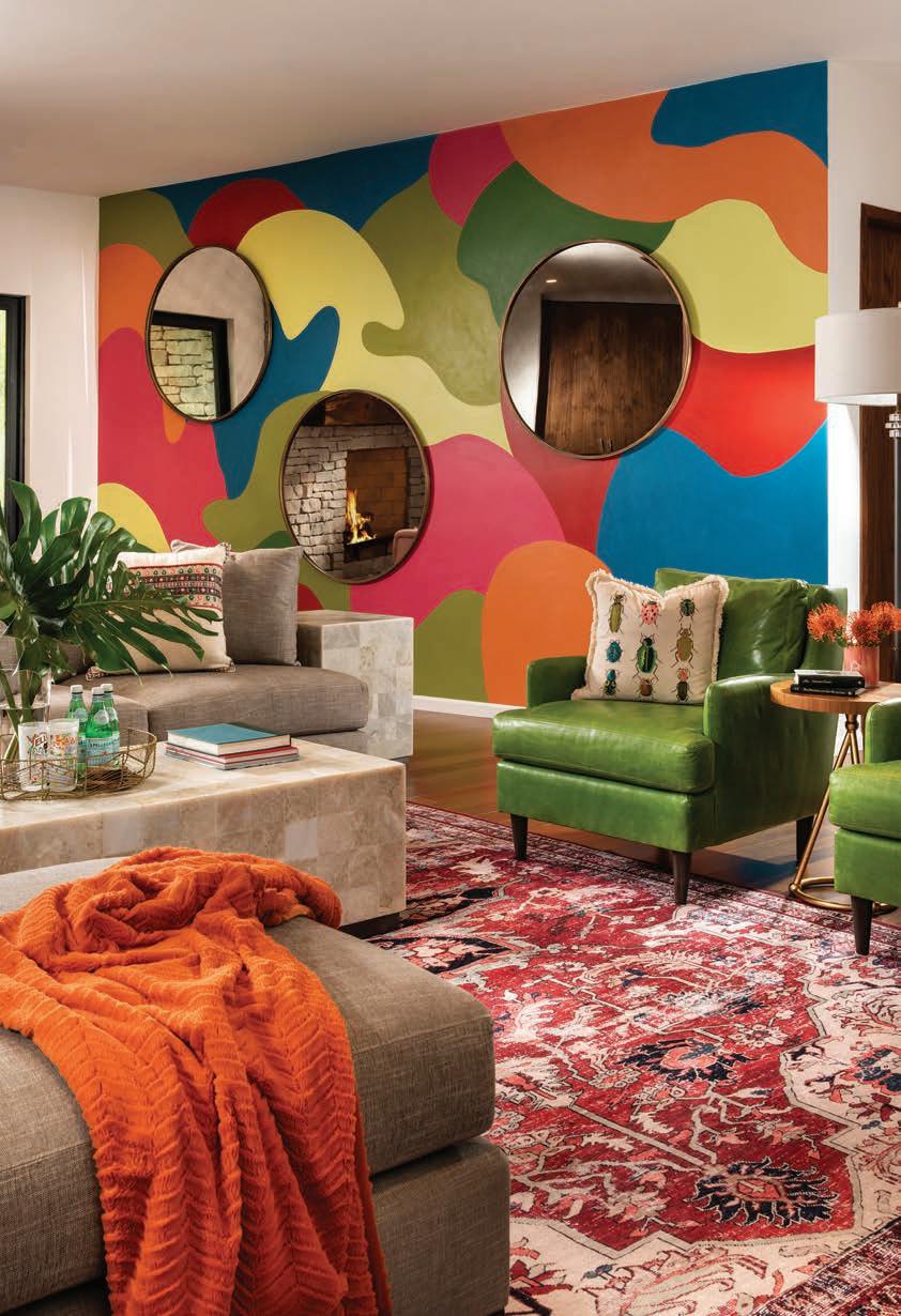 Local artists Colby Kern and Christie Snelson drew the outline and painted the majority of the mural and Taylor selected the colors. However, each family member assisted some in the painting process, making it a truly sentimental work of art. Three large round mirrors hung on the mural reflect the other sitting areas, creating a sense of cohesion and connectedness as the family spends time alone, but together. “The three circular mirrors add another shape and reflectivity,” Taylor says. “I (continued p. 57)