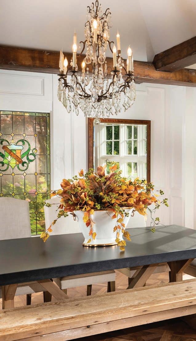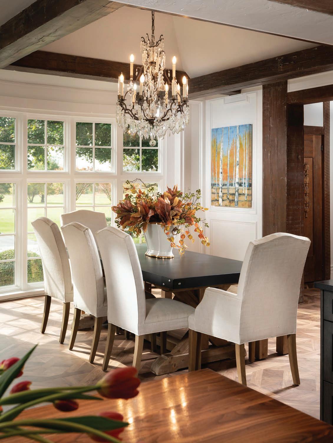 The first order of business was to remove visual weight in the room, including the draperies and tan wallpaper. However, they chose to keep the antique brass and crystal chandelier and original details, such as the stained glass window and rustic wood beams. “All of a sudden, the room had more of a refined rustic elegance,” he says. “It now has the classic traditional look, but downplayed.”