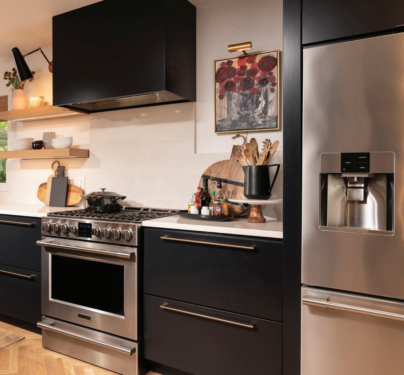 For a slight lean into the midcentury modern look, she chose slab front cabinets in Tricorn Black by Sherwin Williams, which is a true black paint with no blue or brown undertones. She went with this color because she knew it would be a bold neutral that wouldn’t compete with her grand plans for a colorful mural.