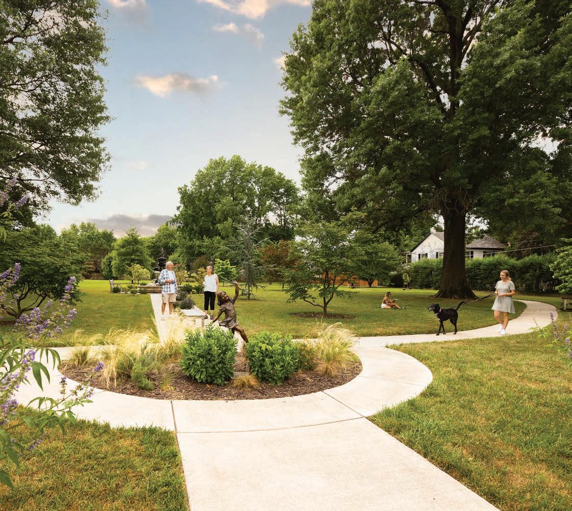 An iron gate with ornate scrollwork and a sign that says “Visitors Welcome” are some of the first visions that greet guests as they enter from historic Walnut Street. Beyond the gate, a paved strolling path that spans ⅛ of a mile wraps around a patinaed bronze fountain (pictured opposite) imported from Europe, and 85 trees, 35 shrubs and 125 perennials are there for your viewing pleasure.