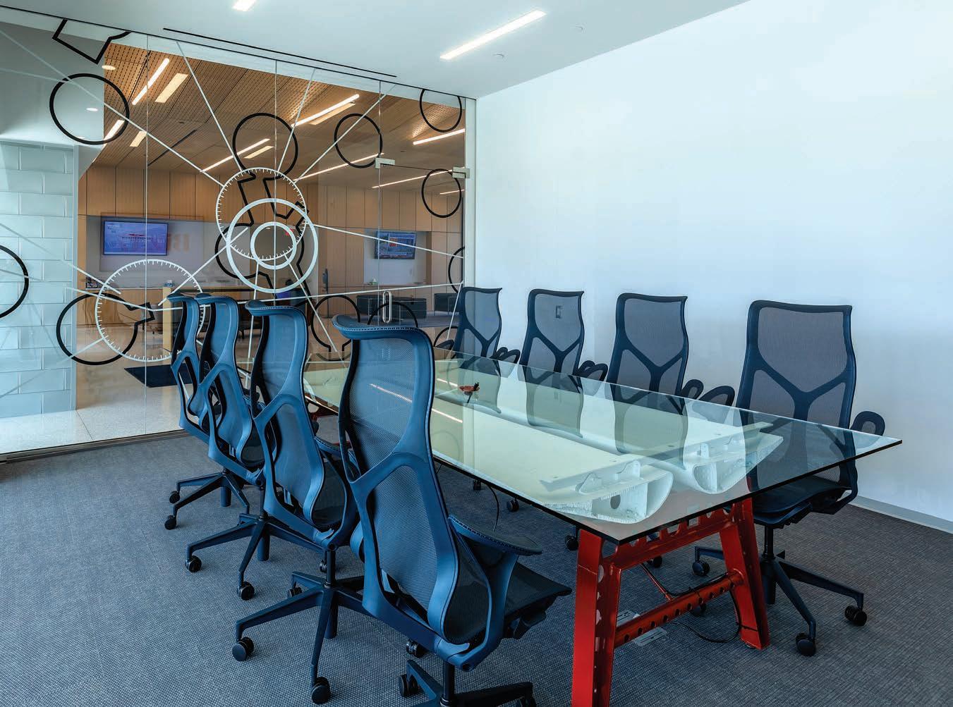 Taking inspiration from FAA sectional aeronautical charts, the design element on this meeting room gives the space a customized look.