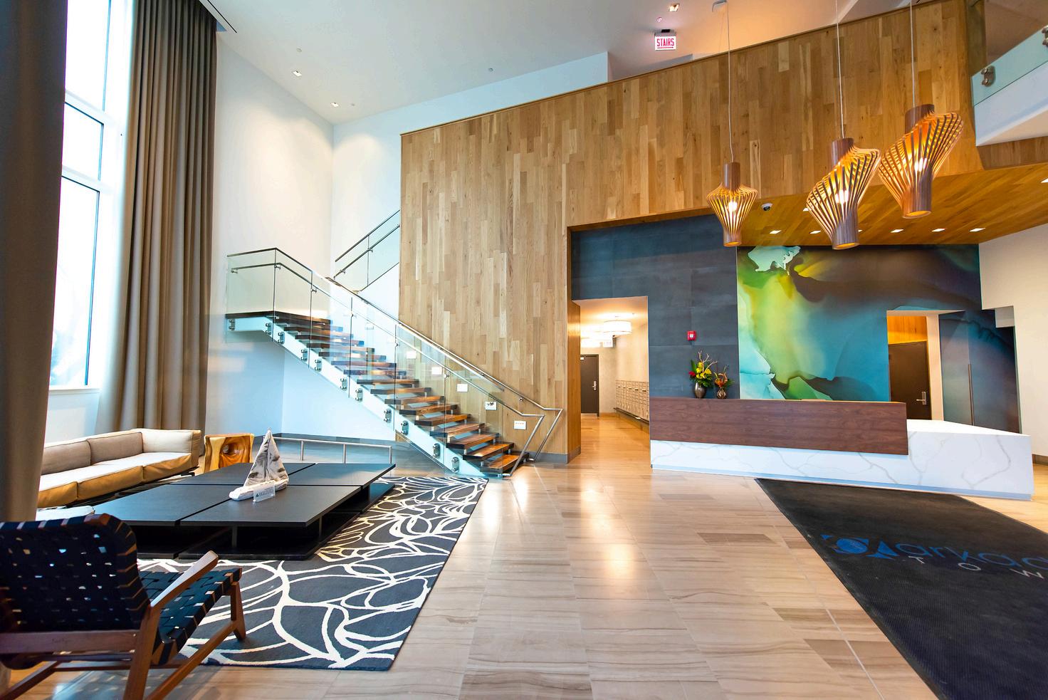 The lobby was a key element in transforming the long-abandoned building shell into a luxurious residential tower The lobby featured an unusually expansive design, framed by oversized metal panels depicting an abstract treescape, manufactured from painted plate aluminum This sophisticated entrance required precise installation and coordination to align with the building’s modern aesthetic and waterfront setting. The project demanded meticulous sequencing to integrate structural reinforcements and high-end finishes, ensuring a welcoming yet architecturally striking lobby space that set the tone for the entire 58-story tower.