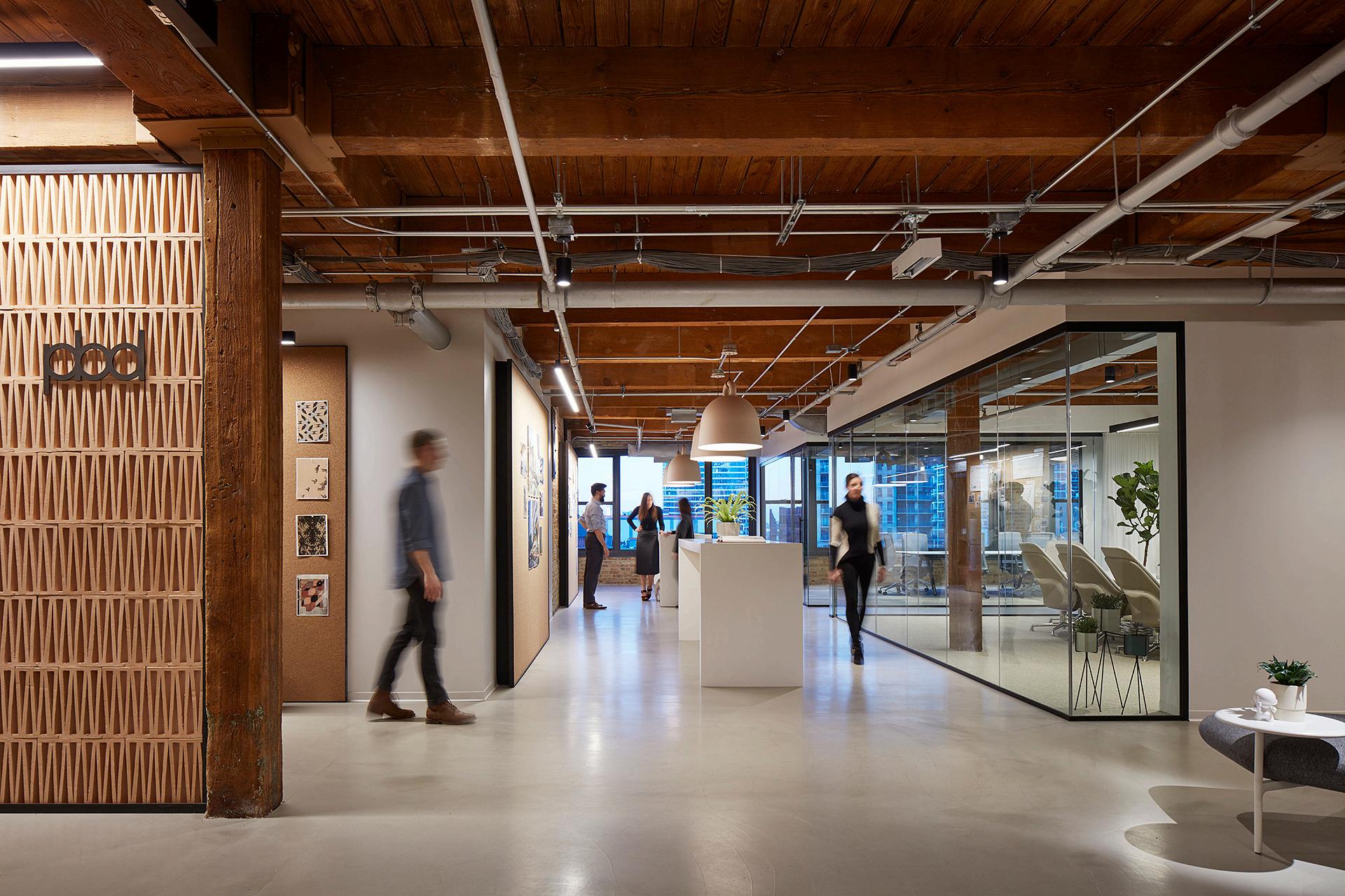 Renovating the Partners by Design office was a complex and rewarding endeavor. The project involved reconfiguring approximately 17,000 square feet to create a modern, innovative workspace that reflects the firm's architectural and design ethos Key challenges included integrating creative environmental branding and custom millwork, while ensuring the space remained flexible and functional for both collaborative and private work settings