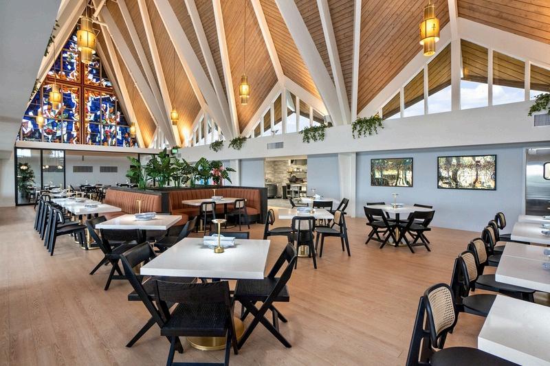 e Lake involved transforming a former church Mediterranean restaurant while preserving its hitectural features. The 15,000-square-foot erwent extensive renovations, including the a new 3,000-square-foot kitchen, a 5,000utdoor patio overlooking Lake Opeka, and the a 2,000-square-foot mezzanine. We had to grate new HVAC, sprinklers, deck lighting, and d for outdoor rentals while maintaining original stained glass and historic lighting.