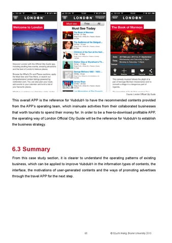 6.3 Summary From this case study section, it is clearer to understand the operating patterns of existing business, which can be applied to improve ϟlubdubϟ in the information types of contents, the interface, the motivations of user-generated contents and the ways of promoting advertises through the travel APP for the next step.