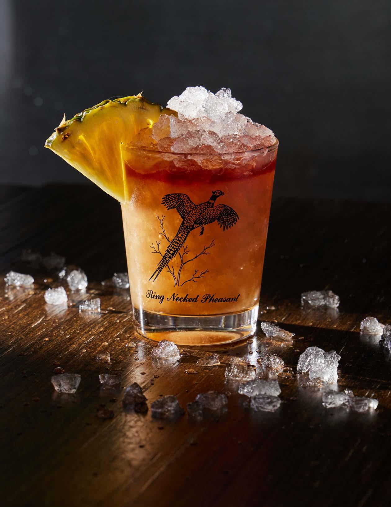 Through trial and error, rye whiskey was ultimately infused with the mustard seed. Garam masala and tamarind simple syrups were then combined with lemon, pineapple, amaro and a splash of bitters. The highball glass is overflowing with crushed ice and melts quickly as you sip on this punchy concoction.