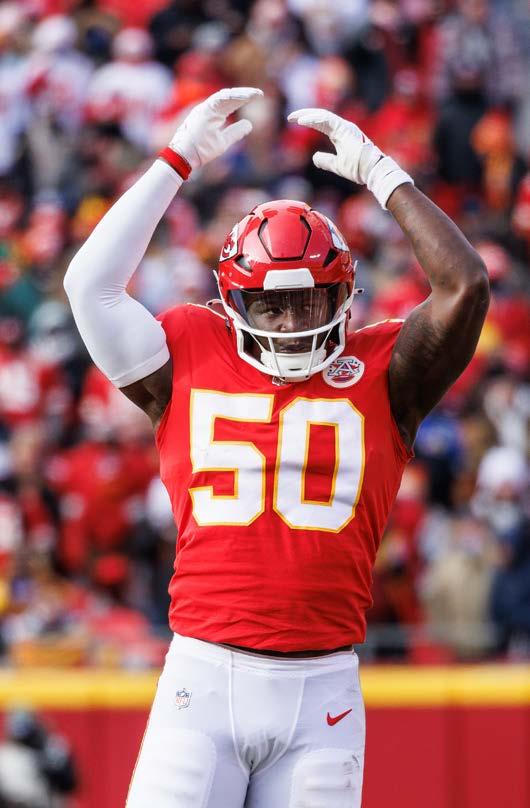 During the offseason, the Chiefs traded away speedster Tyreek Hill, one of the game’s most dangerous wide receivers. There was no splashy replacement, just JuJu Smith-Schuster, a one-time Pro Bowler who hadn’t gone over a thousand yards in the previous three years. Rather than pursue a big-name running back, the team stood pat with Clyde Edwards-Helaire, and, when he went on injured reserve, handed the job to seventhround rookie Isiah Pacheco.
