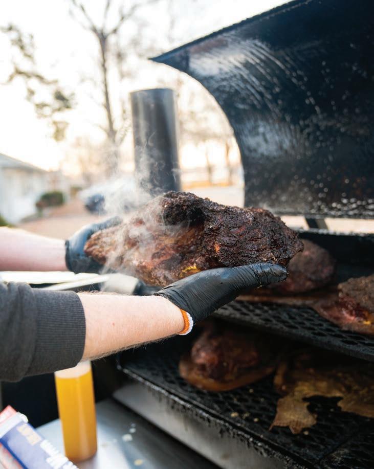 Van Horn also makes creative use of cardboard in his smoking process, which he learned from Zilla’s Pit in Tennessee. He trims a piece to fit the bottom of his briskets. “It just holds the juices and everything to the brisket.”