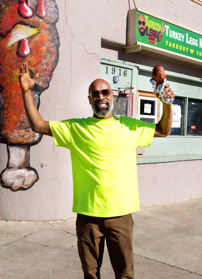 Leggman is famous for the Bustdown, a turkey leg served over a bed of their most popular side—macaroni and cheese. The mac features nicely firm elbow pasta in a creamy white cheese sauce. Stewed greens, also very popular, are richly flavorful with a sneak-up-onyou spiciness. Their beans are sweet and peppery, with both chilies and bell pepper playing key roles. Simply because it’s takeout only, french fries suffer from the trip home in a closed Styrofoam container. Montgomery isn’t looking to expand his modest takeout stand or add a slew of new offerings. For the future, he’s focused on the upcoming World Cup games in Kansas City and hopes to be on the scene with a new food truck.
