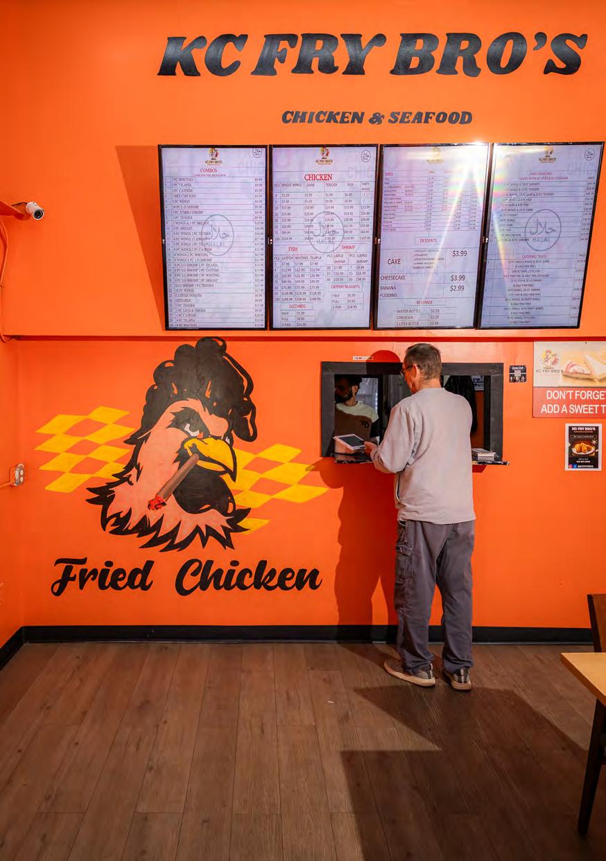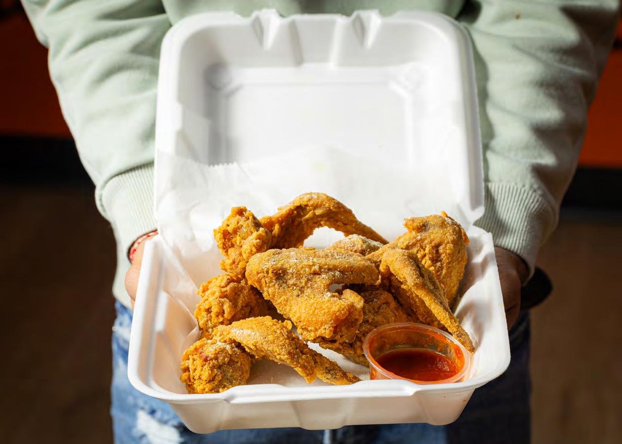 When you visit, you’ll find a massive menu (that includes seafood) and a small dining area with a mural of a chicken smoking a doobie (painted by local muralist Whitney Kerr). When you order at the window, Khan will tell you that your order will, at best, take 10 to 15 minutes because everything is cooked to order. And for a little sweetness, be sure to order a side of fried okra or fried green beans.
