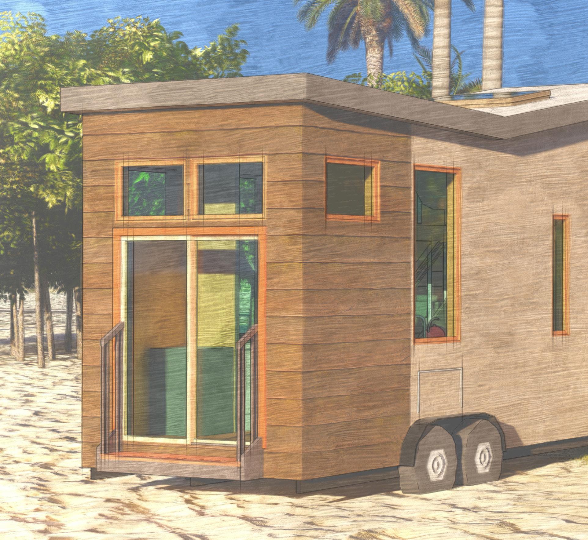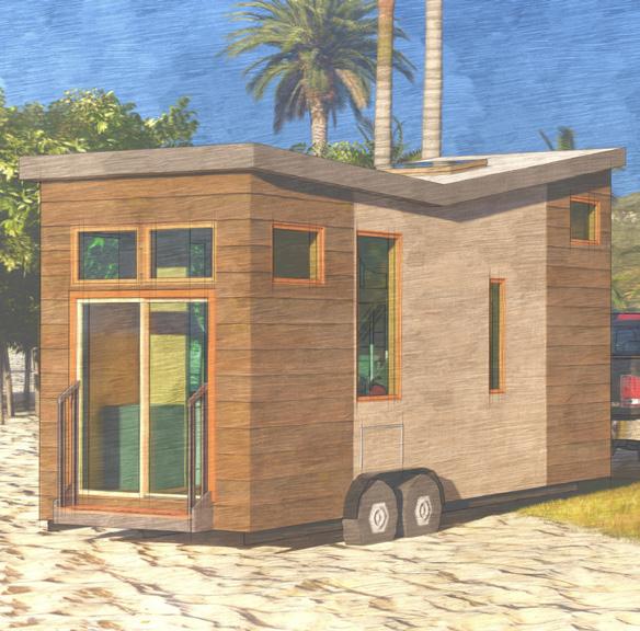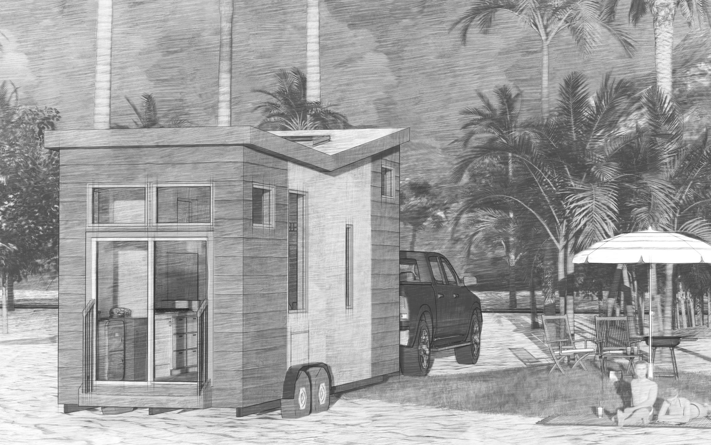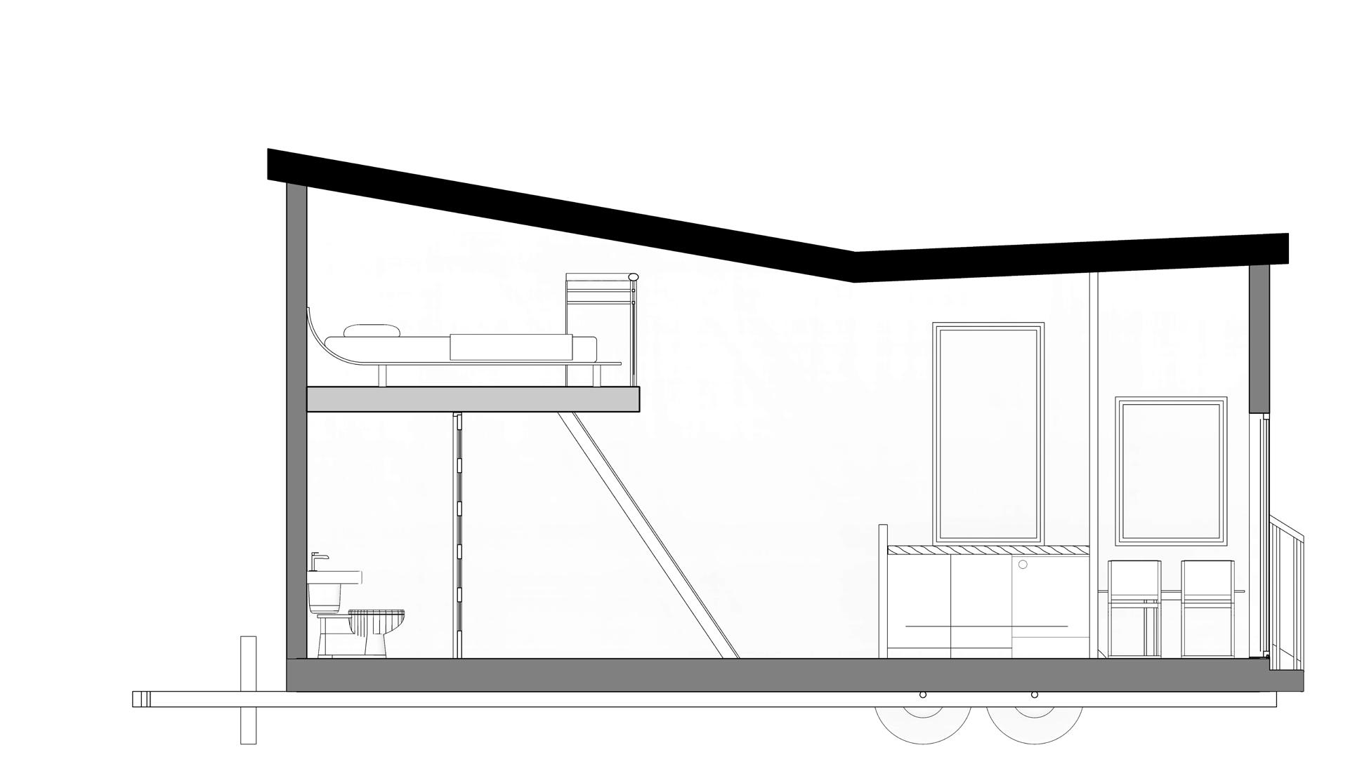 Our vision for the mobile tiny home was to travel coastto-coast across Canada off-grid, resembling a rustic cabin with ample storage and living space. The floor space includes a dining area, kitchen, living area, and bathroom, while the loft has a queen-size bed with a