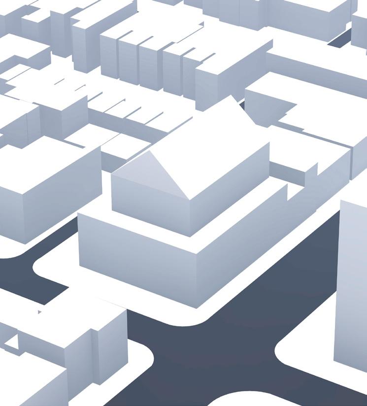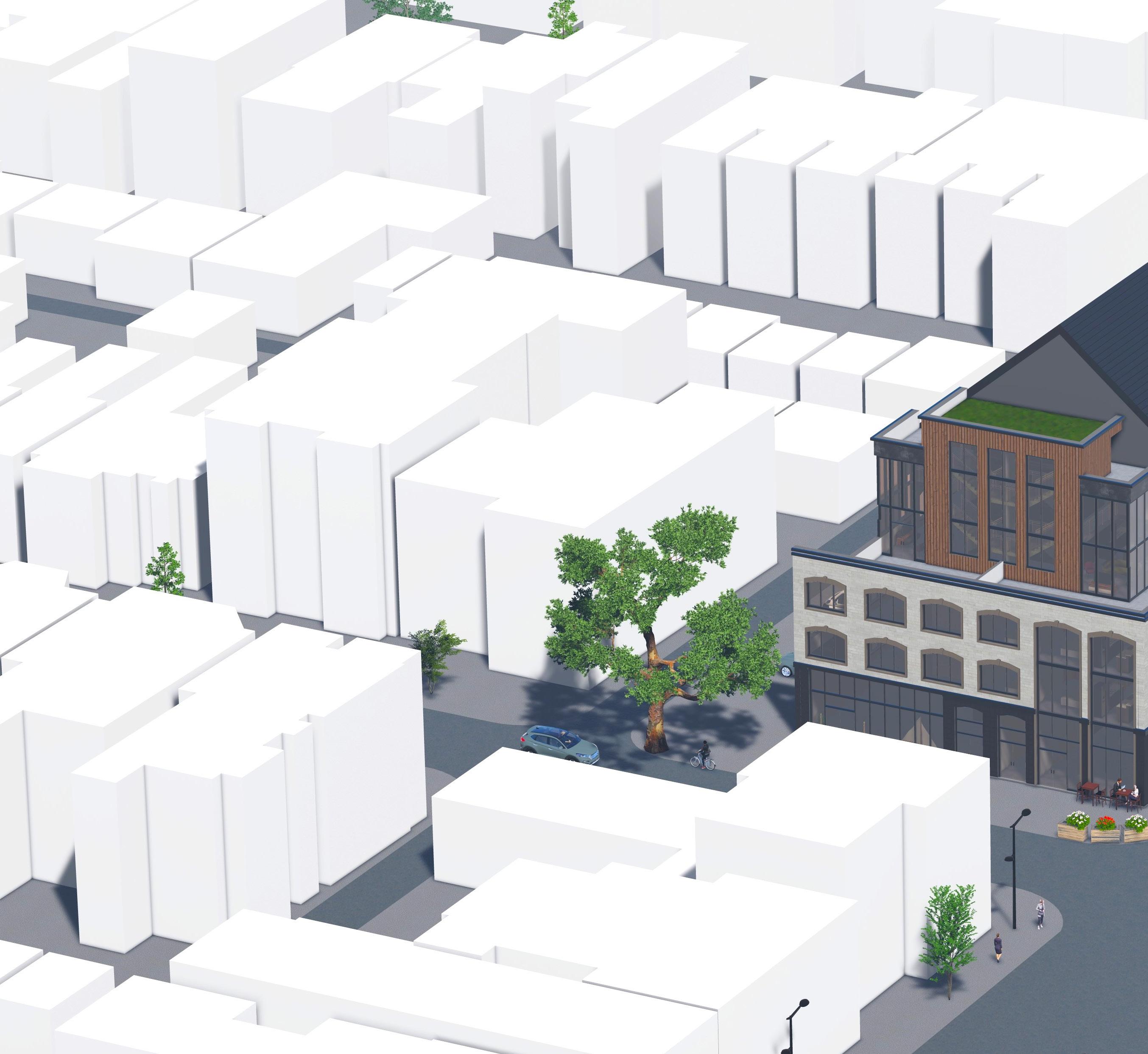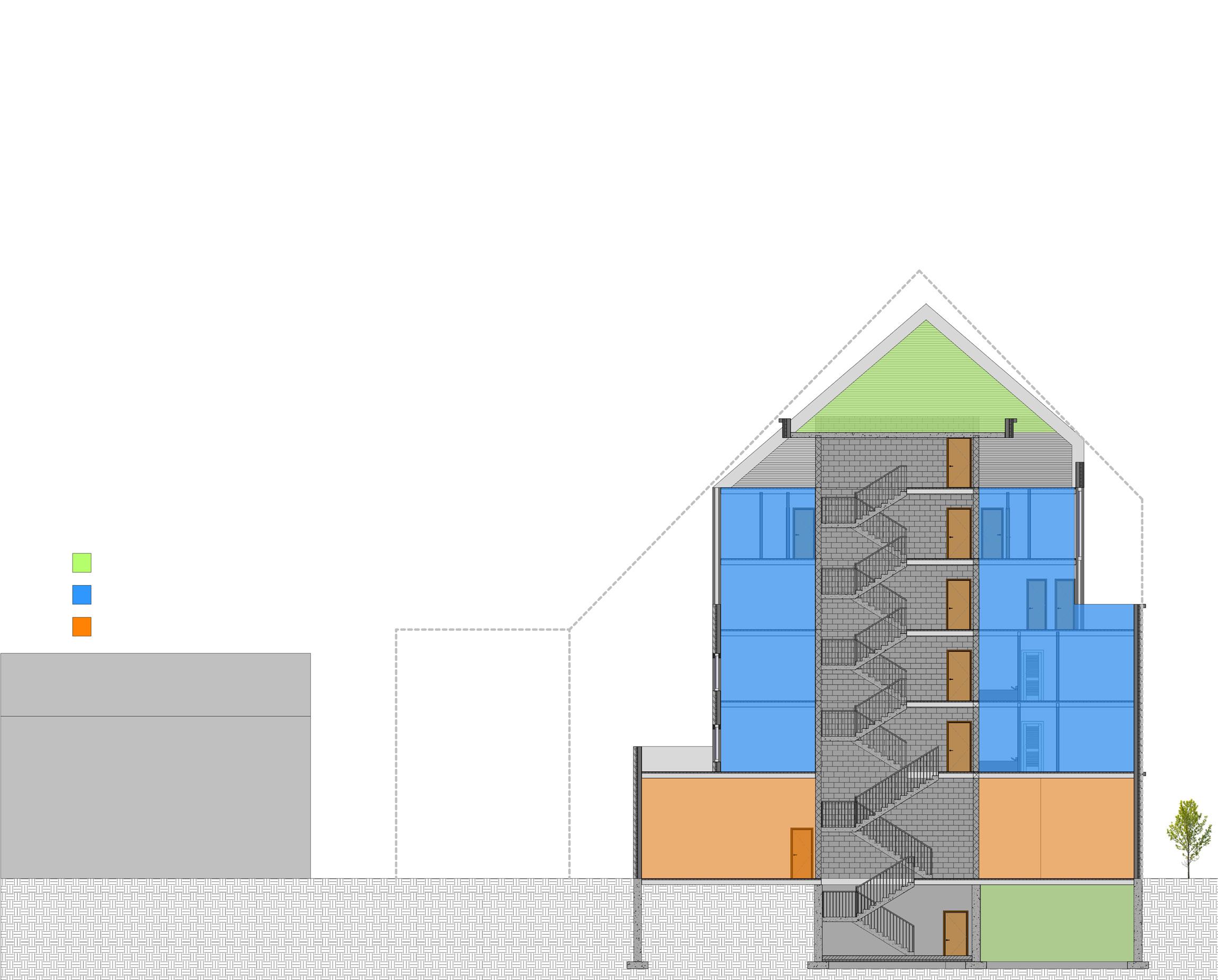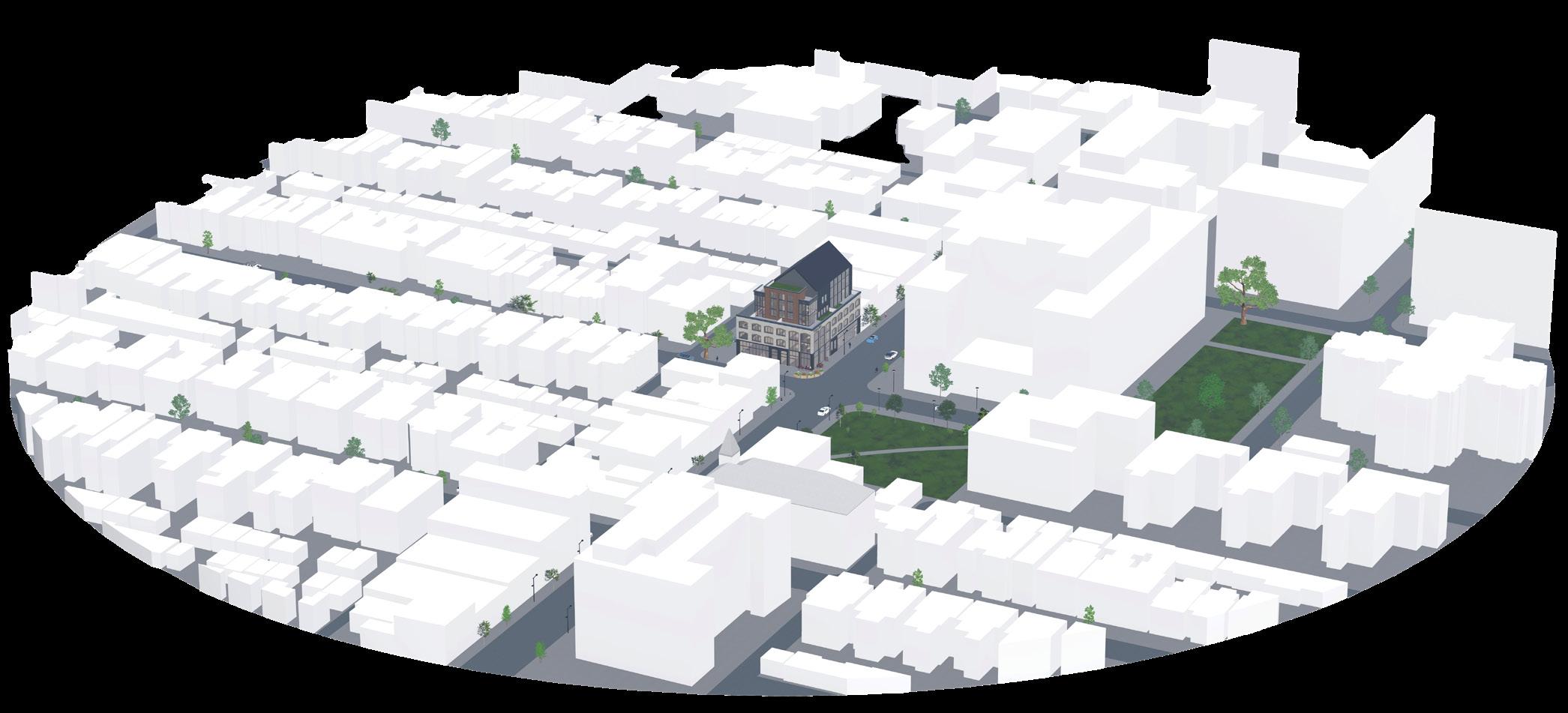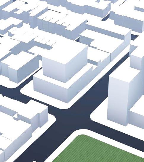 the opportunity to combine the sloping roof shape of the houses with the monotonous shape of the midrise buildings. By complying to the Toronto mid-rise performance standards and zoning, we are able to successfully achieve our objective of designing a building with a distinctive form.