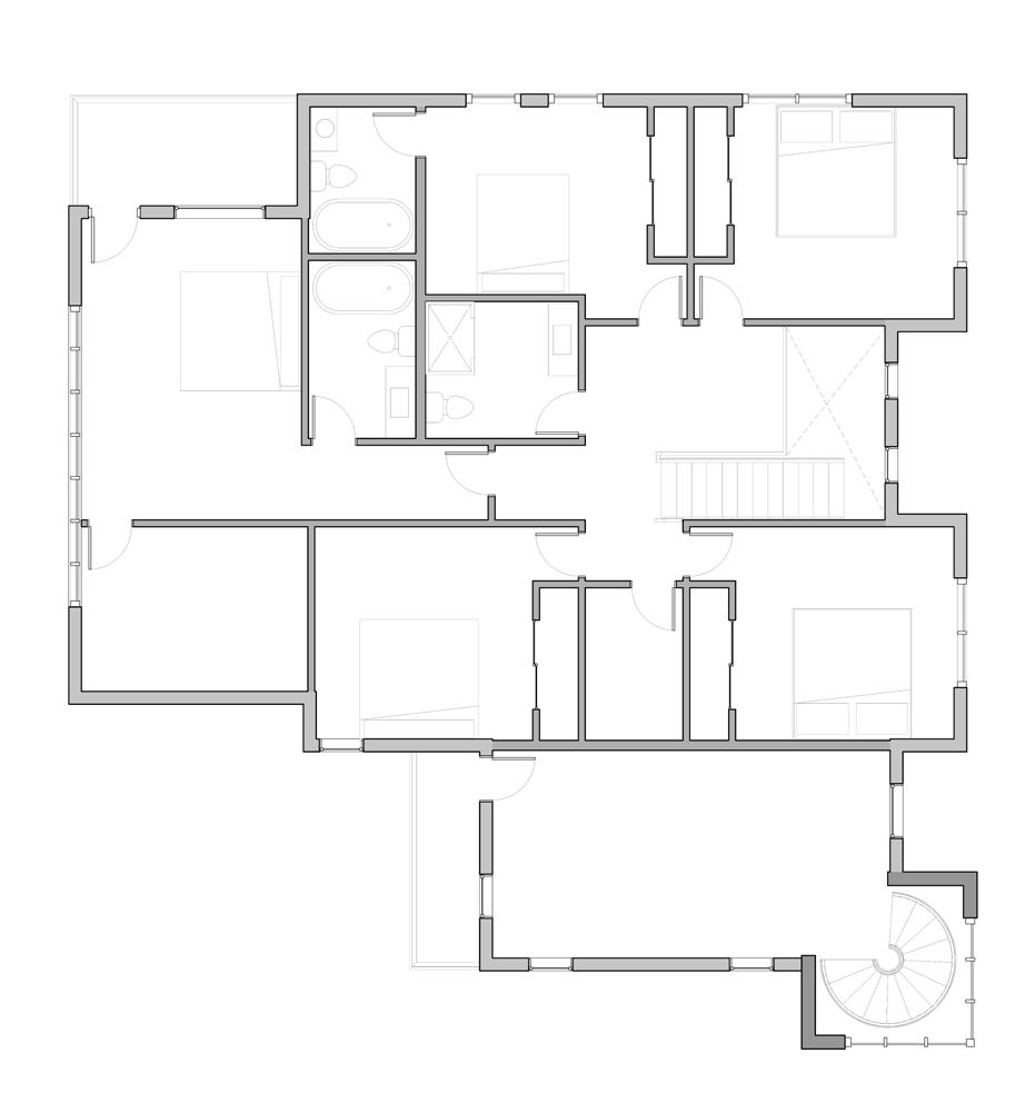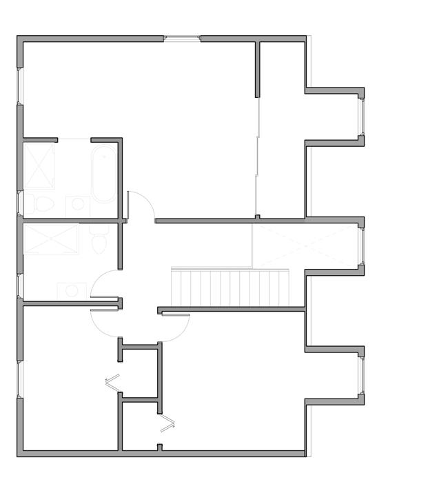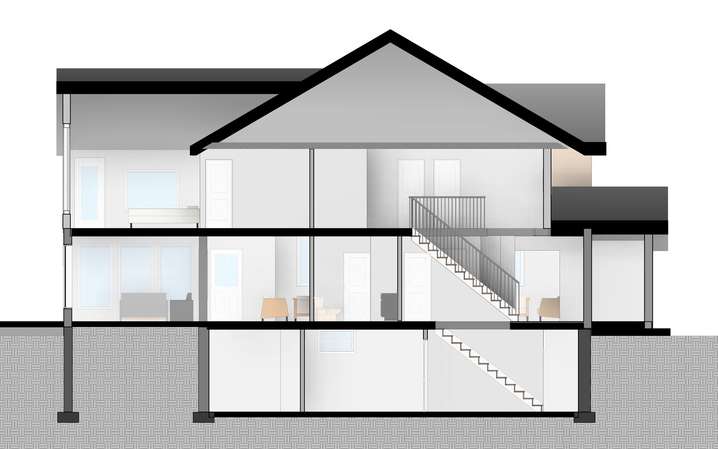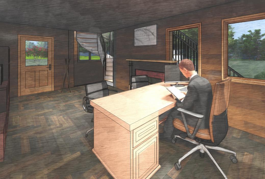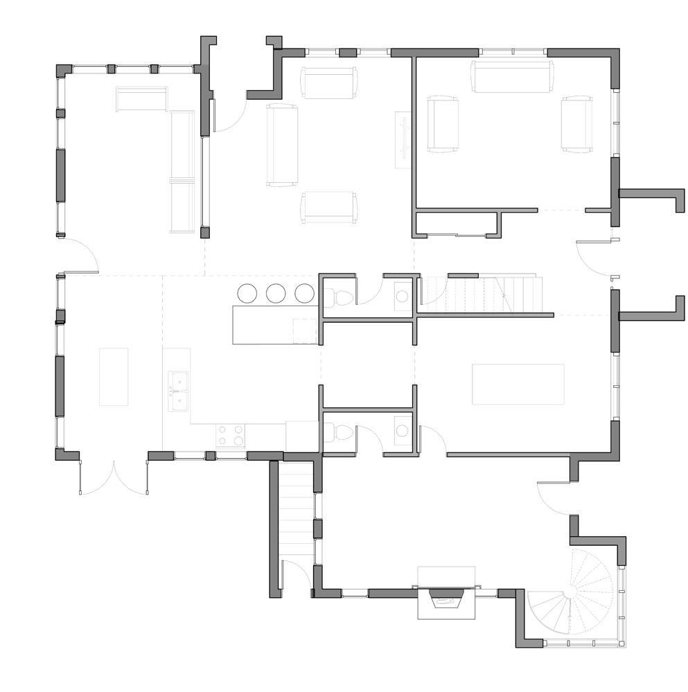 floor plans. The focus is on creating a design that is both aesthetically pleasing and functional, taking into account the family’s budget. All of the client’s new requirements are met, including more natural light, a home office with a separate entrance, and the addition of a new bedroom.