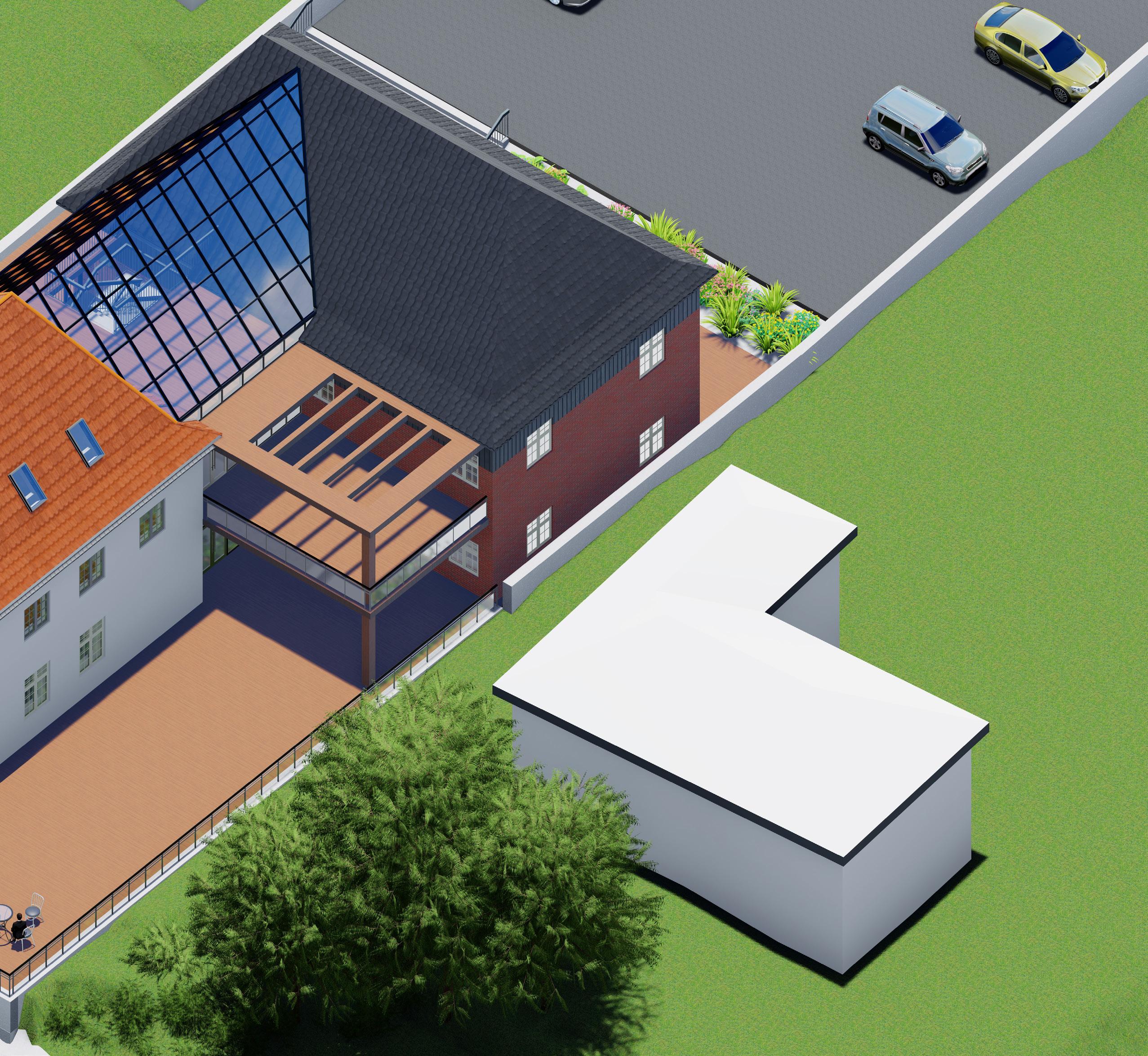 in the new building on the north side of the existing building. The existing building has a sophisticated design with distinctive features. The design constraints demand preservation of the appearance and roof. The new building will retain the original look, with a glass extension connecting the two structures.