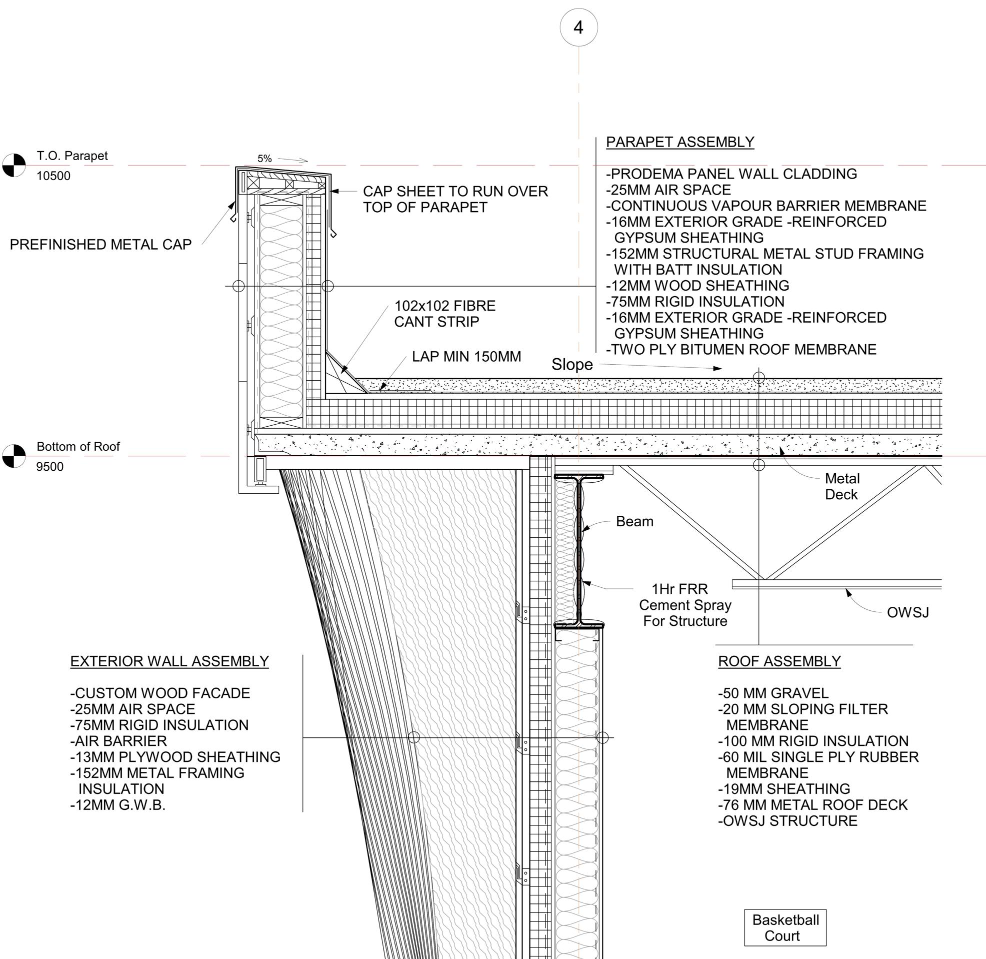 90mm Prodema Roof Panel 35mm Air Space 50mm Rigid Insulation Air Barrier C Channel Joists With Insulation Beam System Vapor Retarder 13mm Gypsum Wall Board 90mm Prodema Roof Panel 25mm Air Space 75mm Rigid Insulation Air Barrier 13mm Wood Sheathing 152 Metal Stud Layer Vapor Retarder 13mm Gypsum Wall Board 200mm Metal Rood Deck on Beam and OWSJ System Ceiling Tiles Boiler Room Double Glazed Curtain Wall Double Glazed Window Gym 30mm Floor Finish 12mm Acoustic Pad 200mm Concrete Floor Slab 13mm G.W.B 50mm Gravel 20mm Sloping Filter Membrane 90mm Rigid Insulation 15mm Water Proofing Membrane Air Barrier 200mm Concrete Slab 13mm G.W.B Common Space 102mm Brick 75mm Rigid Insulation Air Barrier 13mm Wood Sheathing 152mm Metal Stud Layer 13mm Wood Sheathing Air Barrier 75mm Rigid Insulation 102mm Brick 13mm G.W.B 92mm Steel Stud 13mm G.W.B 30mm Floor Finish 12mm Acoustic Pad 200mm Concrete Floor Slab 13mm G.W.B Hallway Kitchen Sixth Floor Fifth Floor Fourth Floor Concrete Column Concrete Beam Steel Column Steel Beam Steel Column Concrete Column