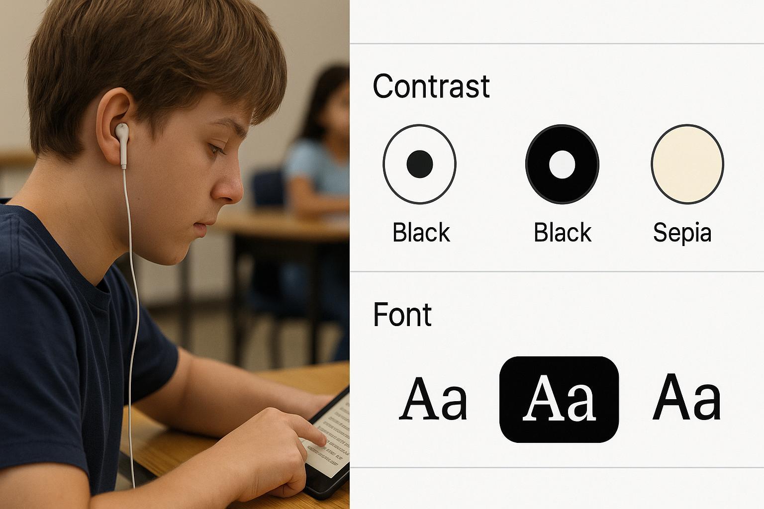 Descripción visual: Video corto de estudiante activando texto a voz; captura de pantalla mostrando opciones de contraste y tipografía.