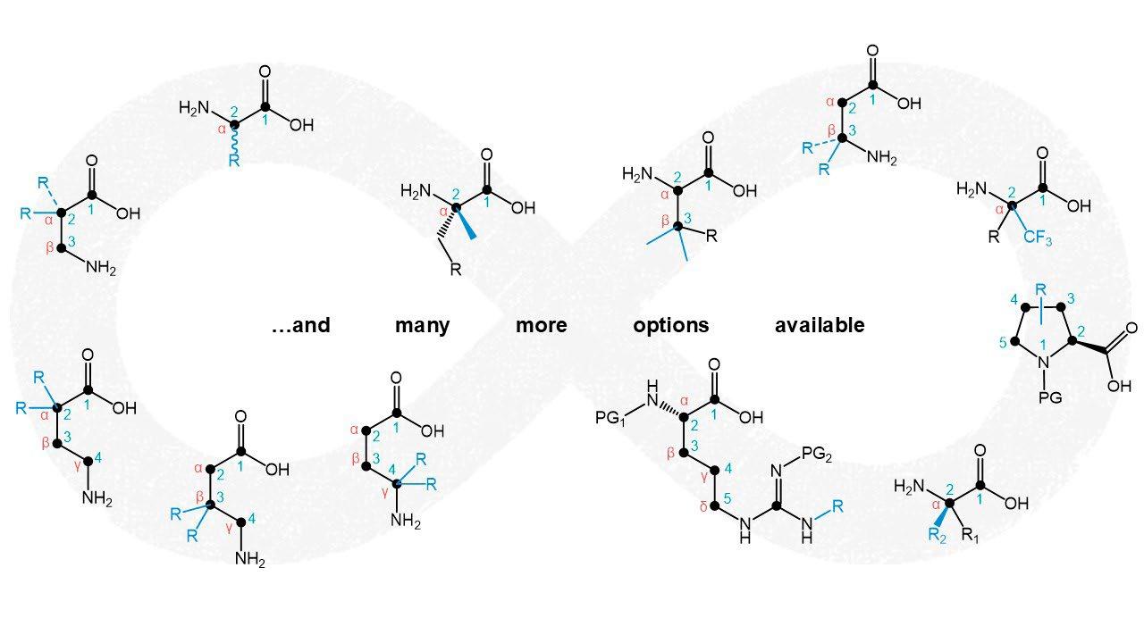 Standards such as Fmoc-D/L-AAA and Boc-D/L-AAA, Smoc amino acids for peptide synthesis in water, variety of protecting groups (e.g., Pbf, Trt, tBu, Bzl, Acm, Mob, SIT, Phacm, Allocam, Mmt), unusual amino acids, fluorinated derivatives, substituted prolines, arginine analogs