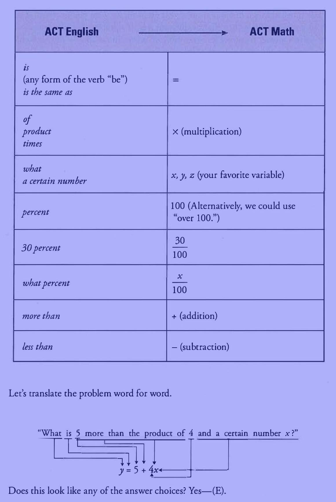 ACT math is not exactly the same as the math you do in school. Yes, many of your old favorites will show up here (ratios, two-variable equations, the Pythagorean Theorem, and many more!) but the questions are a little bit different. In school, you learn content. For example, you learn algebra, then you learn how well you are tested on how well you use algebra. The ACT gives you a problem and asks you to solve it any way you can. The ACT does not care if you know the formulas, they simply want the right answer. If you need a formula to find the answer then use algebraic formulas to find the right answer But, if you can use basic arithmetic to answer a problem, they do not care what steps you take to get there. Throughout our class, we will focus on helping you find the most efficient and successful way to find the right answer within the time period given.