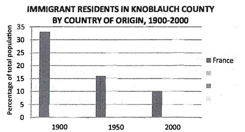 So, for example, the first bar shows the percent of the population.in 1900 who were from France. The bar stops between 30 and 35, so call it 33. Therefore, that bar tells us that in 1900, 33% of the total population of Knoblauch County immigrated from France. OK, let's look at the choices. As we discuss each choice we'll reproduce the graph but only highlight the relevant bars.