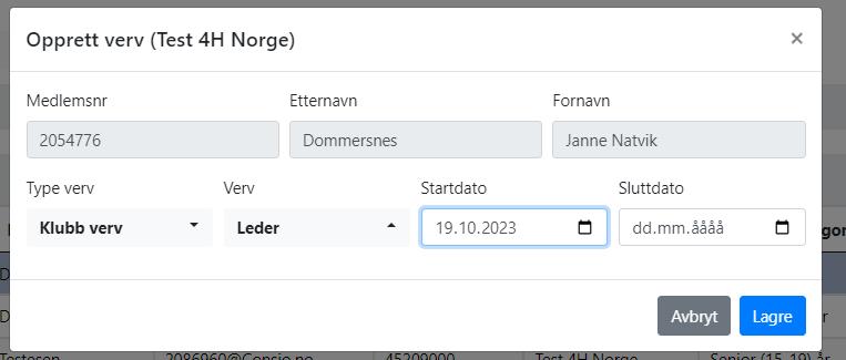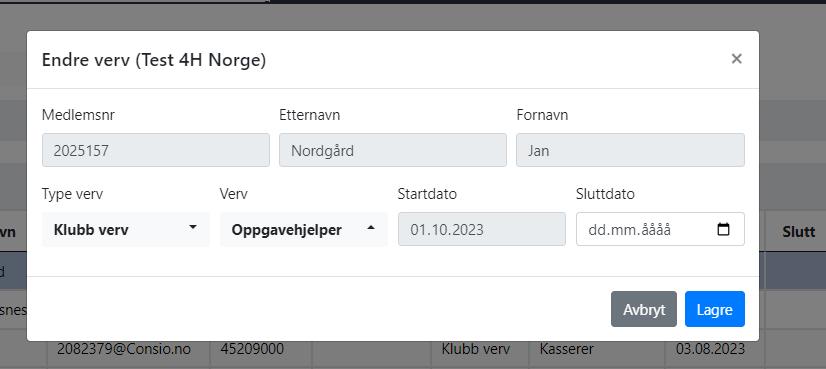 • Hvis medlem Per (sekretær i 2021) er blitt valgt til leder, settes sluttdato på vervet som sekretær og oppretter nytt verv som leder. Da vises alle vervene i historikken, slik at medlemmet får riktig 4H-vitnemål.