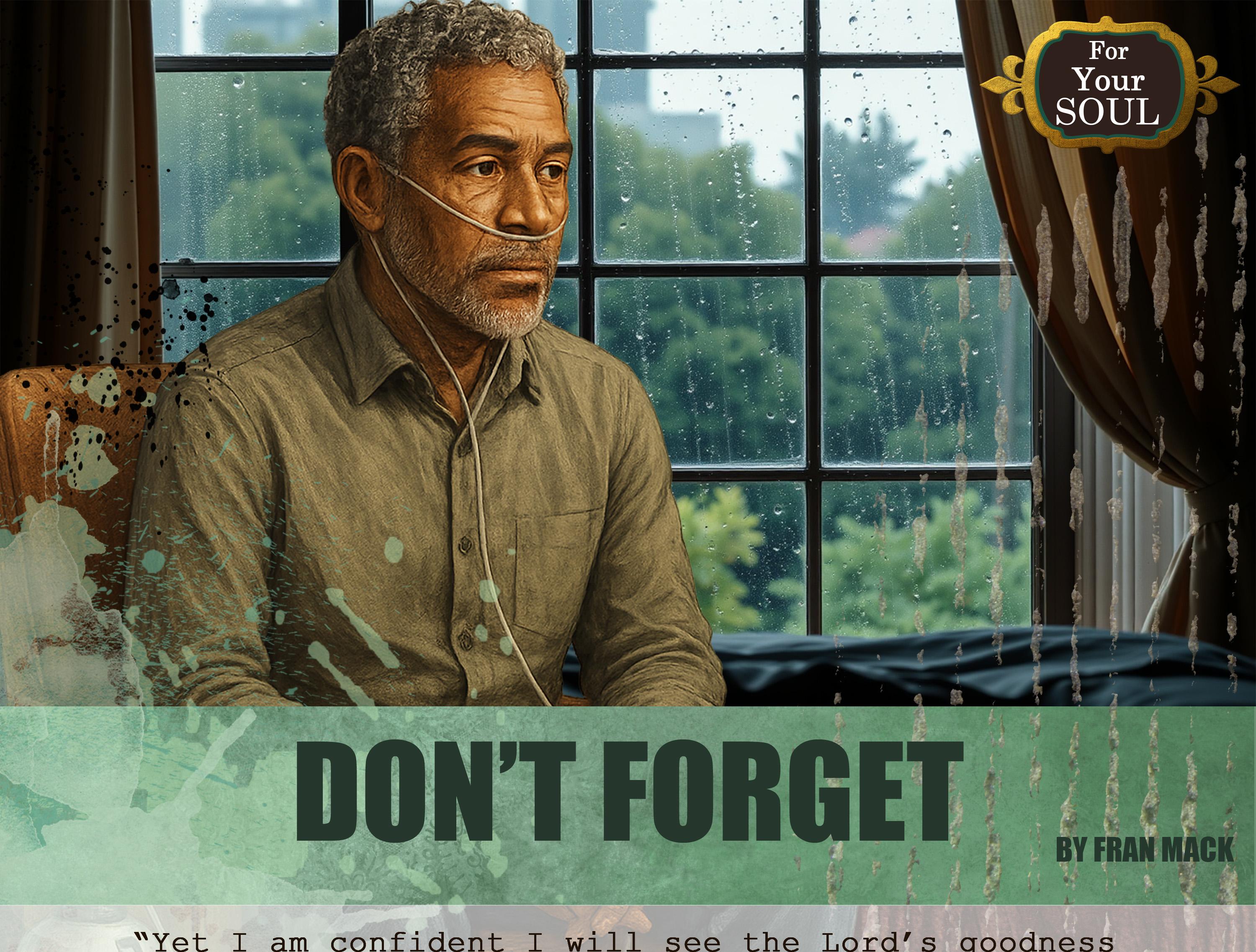 In the quiet moments, when the oxygen tank hisses and the weight of life feels too heavy, remember the times when God has been faithful. Remember the prayers answered, the quiet moments of peace He has given, and the big miracles as well as the small ones. As we grow older, we may lose some things, but we can never lose the love of God. He’s good all the time, and He will never fail us. Don’t forget. ■