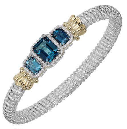 Vahan Blue Topaz & Diamond bracelet - Sterling Silver with 14kt yellow gold accents. 3 emerald cut London Blue Topaz stones surrounded by diamond halos, 0.24cttw