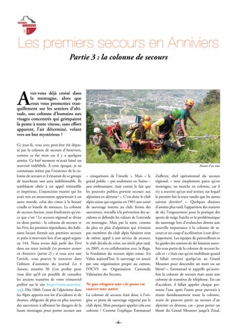 Ce jour-là, vous avez peut-être été dépassé par la colonne de secours d’Anniviers, comme ce fut mon cas il y a quelques années. Ce bref moment m’avait laissé un souvenir indélébile. À cette époque, je ne connaissais même pas l’existence de la colonne de secours et il émanait de ce groupe de marcheurs une aura indéfinissable. Ils semblaient obéir à un appel irrésistible et impérieux. L’injonction muette qui les avait mis en mouvement appartenait à un autre monde, celui des cimes à la beauté cruelle et lourde de menaces. La colonne de secours fascine, mais finalement qu’estce que c’est ? Le secours régional se divise en deux parties : la colonne de secours et les First, les premiers répondants, des habitants locaux formés aux premiers secours et prêts à intervenir lors d’un appel urgent au 144. Nous avons déjà parlé des First dans un texte intitulé Les premiers secours en Anniviers (partie 2) ; si vous avez raté l’article, vous pouvez le retrouver dans l’édition d’automne du journal Les 4 Saisons, numéro 56 (j’en profite pour vous dire qu’il est possible de consulter les anciens numéros de votre trimestriel préféré sur le site https://www.anniviers. org). Dès 1860, l’essor de l’alpinisme dans les Alpes apporta son lot d’accidents et de drames, obligeant de plus en plus souvent des sauveteurs à affronter les dangers de la haute montagne pour porter secours aux