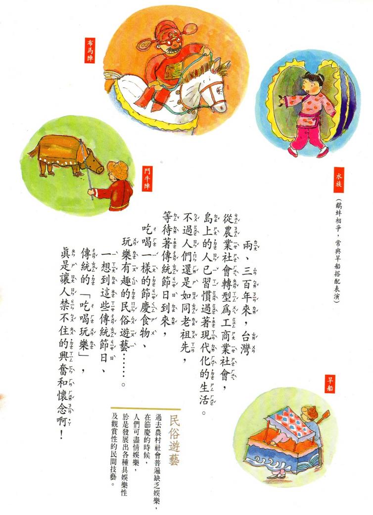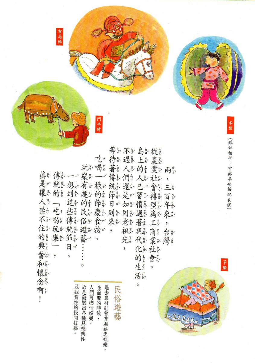 ⺠俗別 理台灣⺠俗⽂⽣實境⽣命禮俗歲廟會典廟裝信仰 俗五 甲.⺠間⽂學⼝傳⽂學神話傳⺠間故事話語 語 ⼄.⺠間⾳和蹈歌仔歌蹈陣(⾞⿎弄⼗⼆ ) 丙.⺠間曲曲歌仔布袋 丁.⺠間競技獅陣頭 戊.⺠間/童玩⽵蜓彈珠