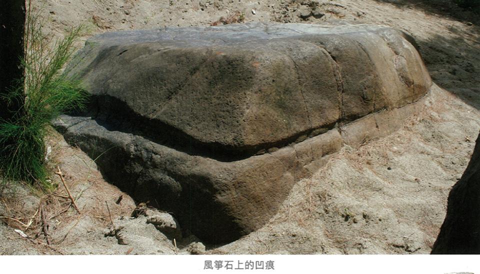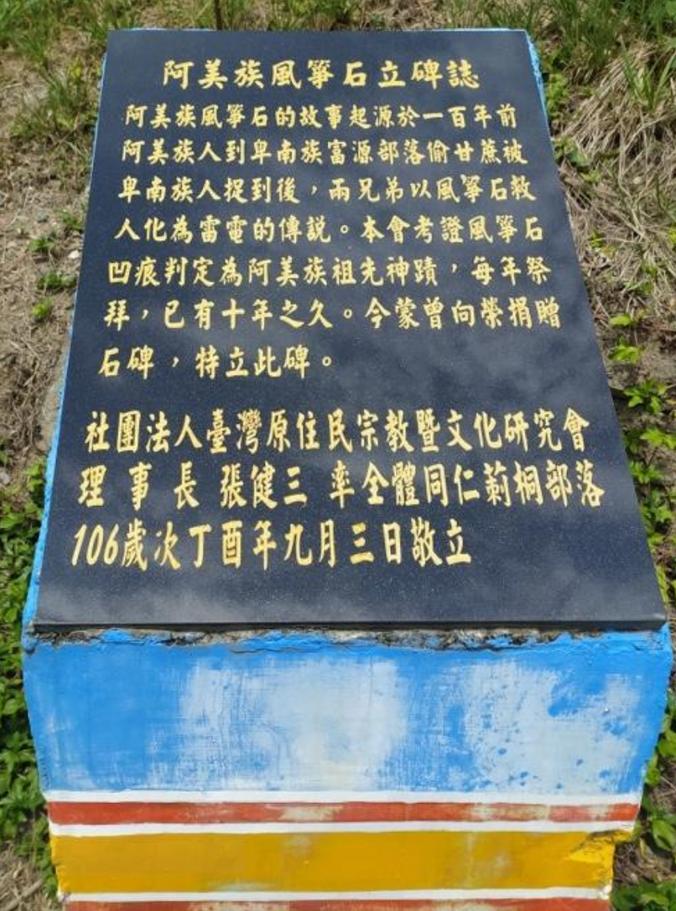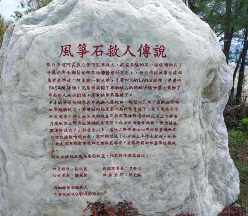 ⽅約200公尺、防⾵林下的海邊,巨⽯四周有類似繩 索 縛的凹槽,據傳就是「⾵箏救弟」神話中榜⾵箏地 點,每年卑南族、阿美族⼈都會到這塊聖⽯前祭拜。