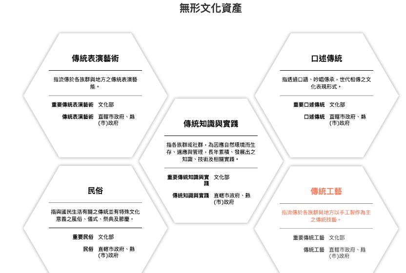 形∕形 形⽂產之包括了下五⼤別 (⼀) 傳表演傳於各群⽅之傳表演 (⼆) 傳⼯傳於各群⽅⼿⼯製作為主之傳技 (三) ⼝傳⼝語唱傳世代相傳之⽂表現形式 (四) ⺠俗國⺠⽣活關之傳並⽂意義之俗儀式典 (五) 傳知識實踐各群或社群為因應⾃環境⽽⽣存應理⻑ 年累積發展出之知識技相關實踐
